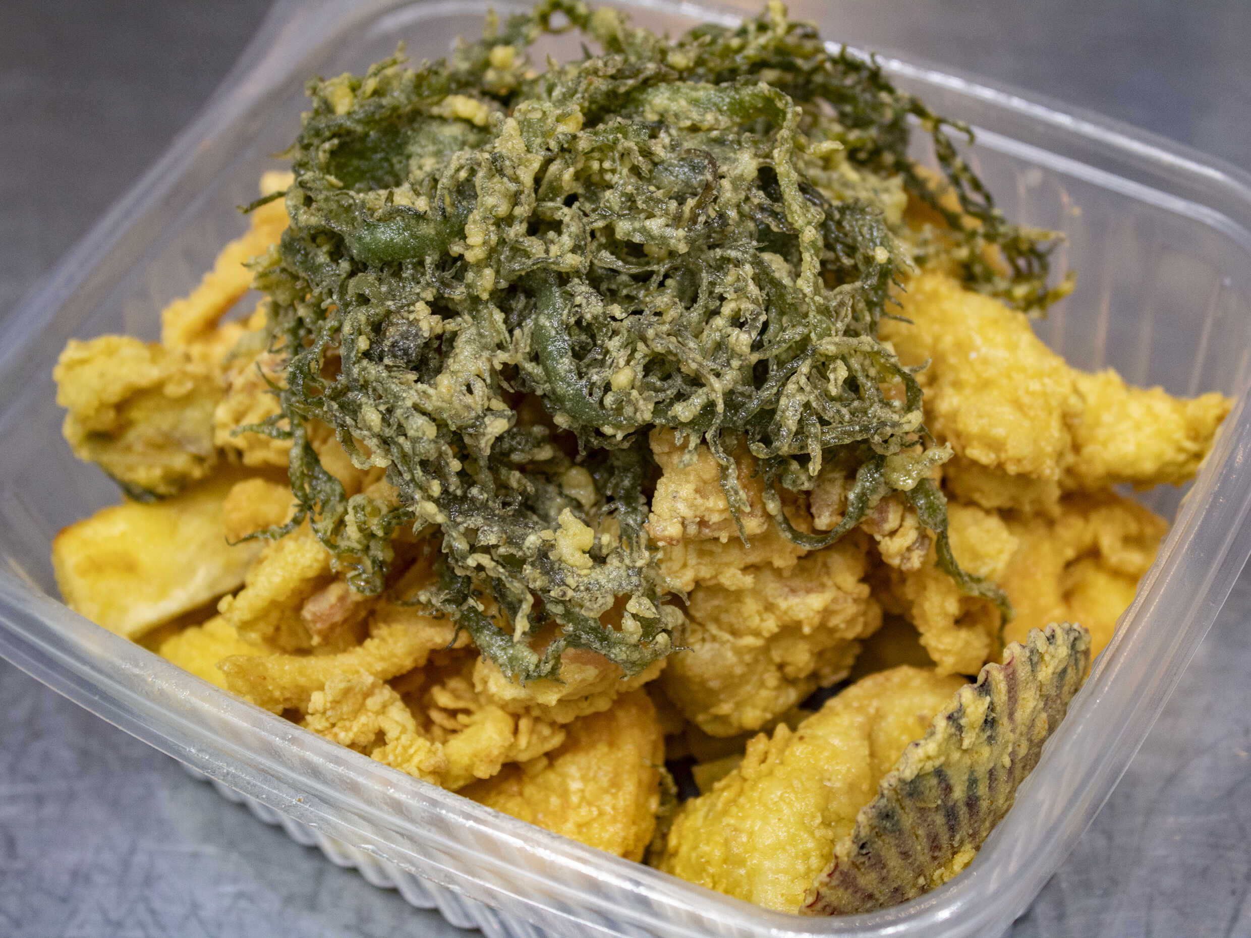 Variedad de mixtura empanizadas y servido con yuyo frito , chifles, y yucas doradas.