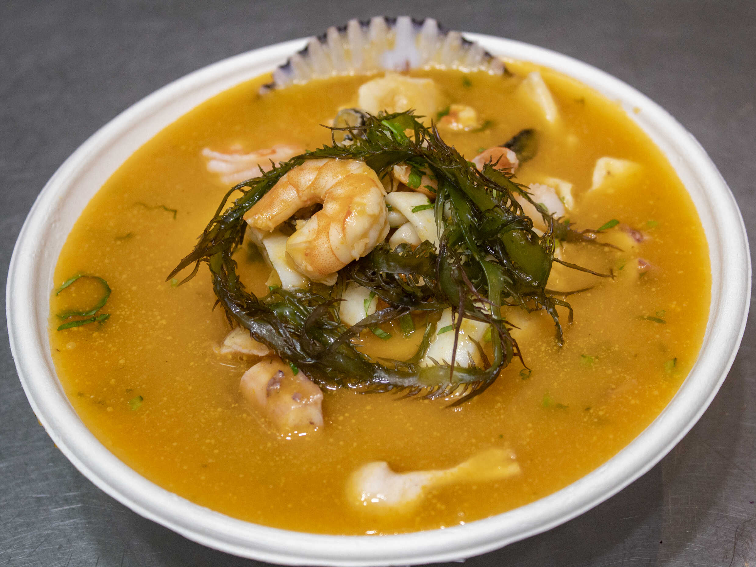 Langostinos, caracol, pulpo, pescado y concha de abanico, acompañado de choclo, cebolla, camote + ají al gusto .