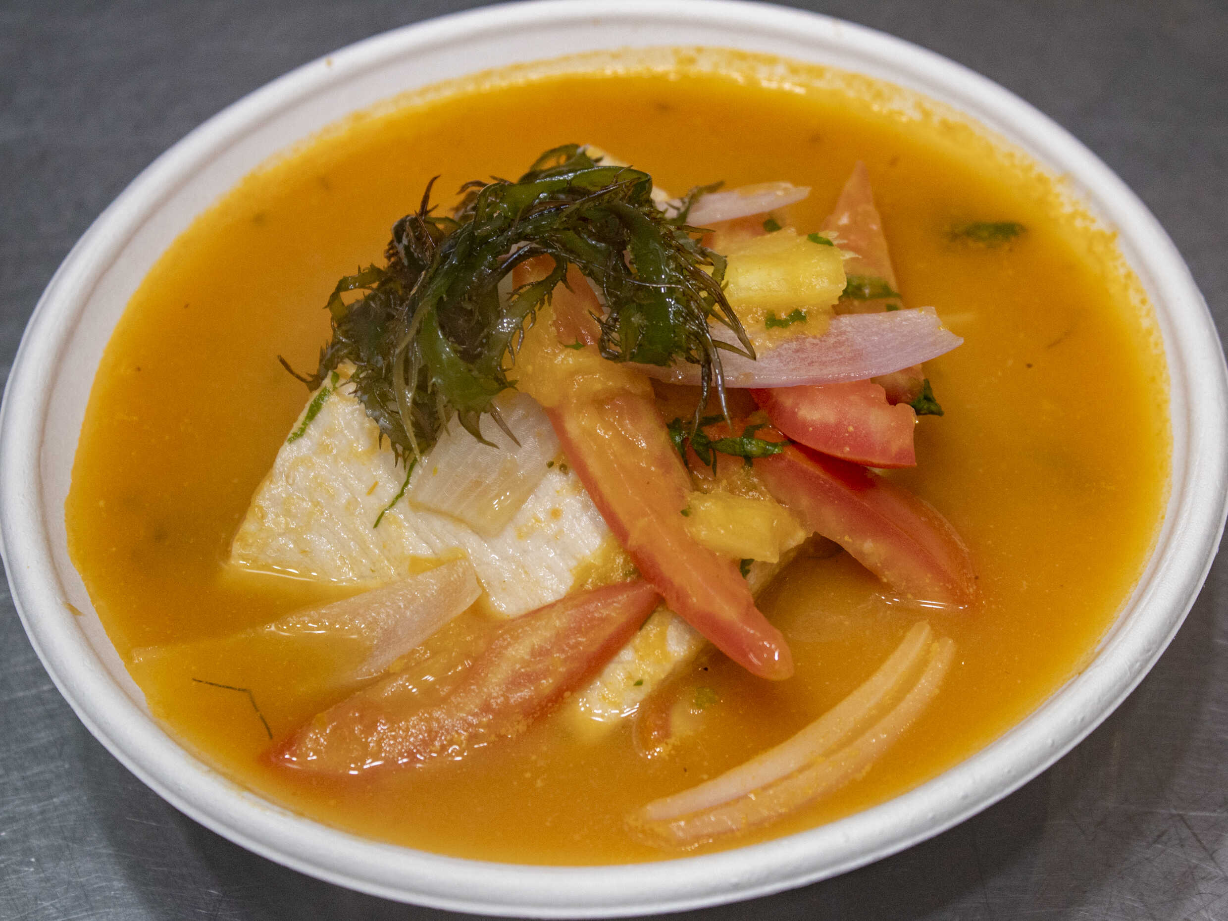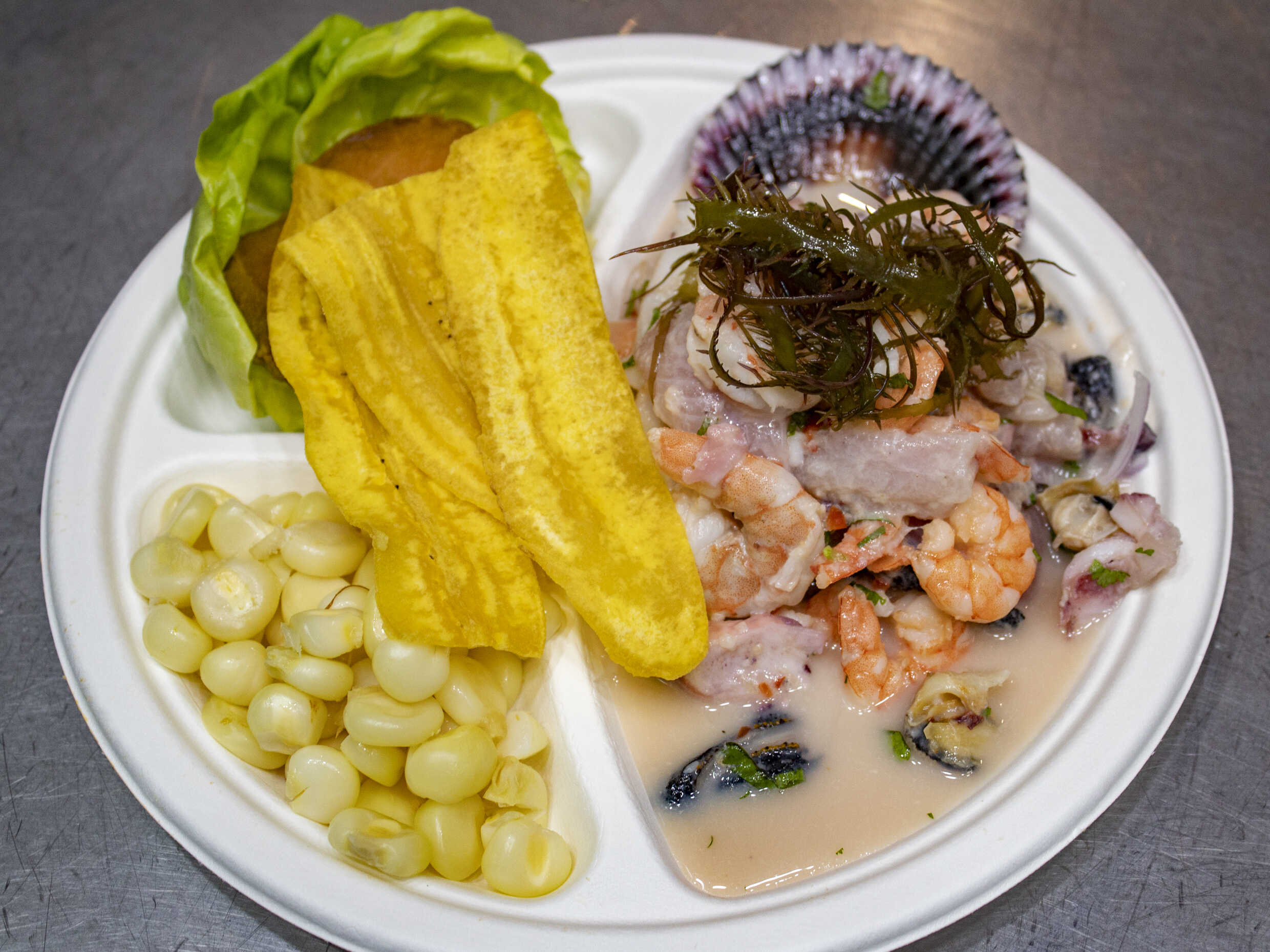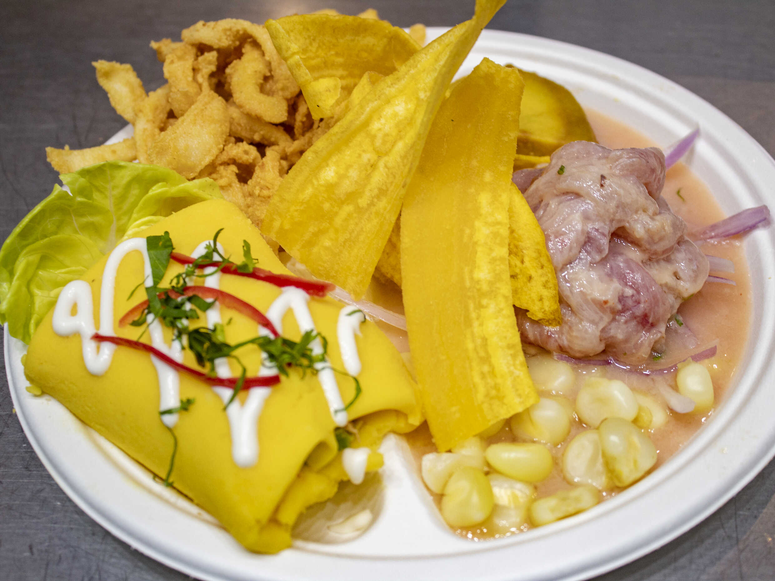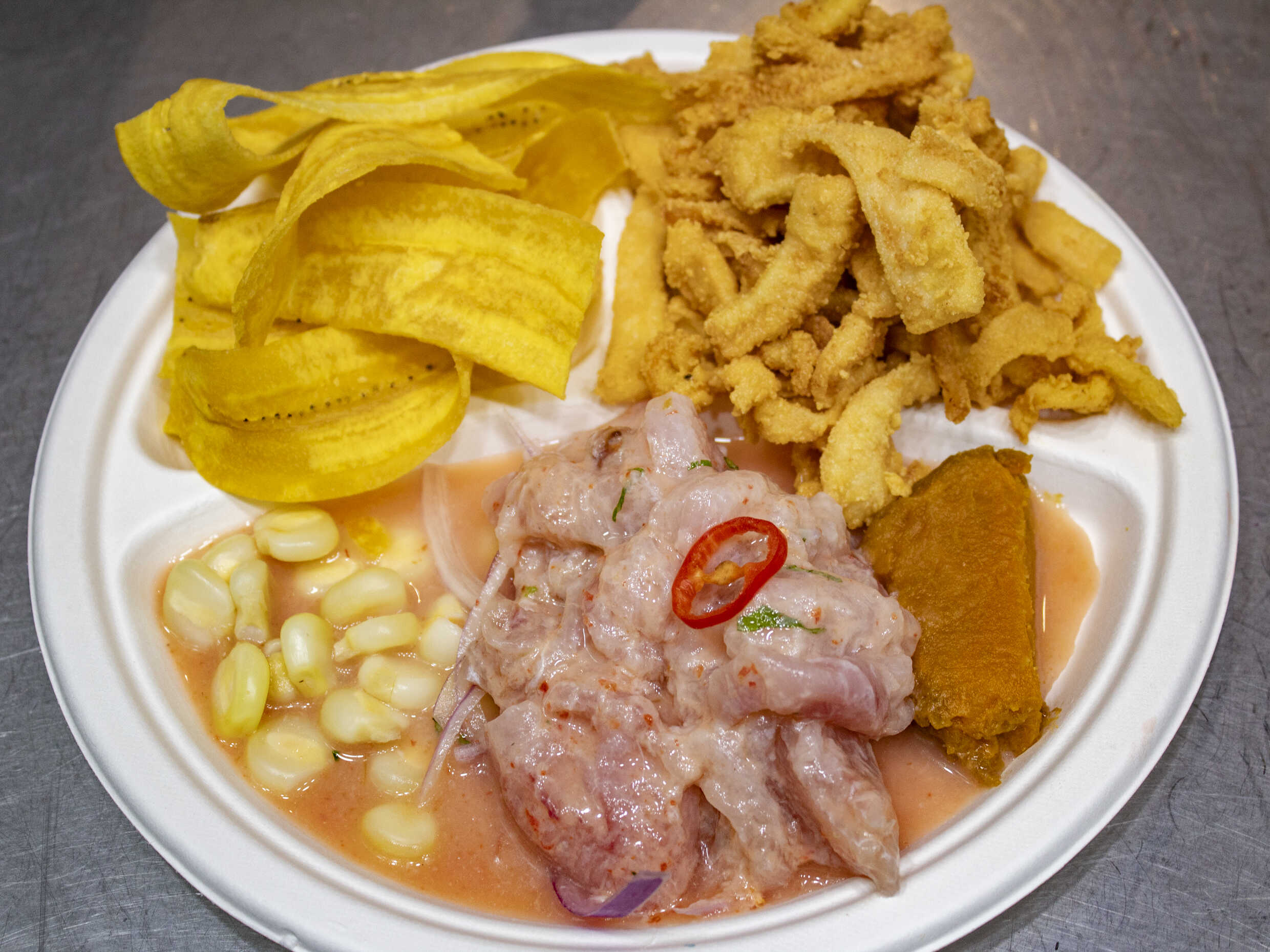 Trozos de pescado marinado en zumo de limón, acompañado de choclo, cebolla y camote mas aji al gusto .