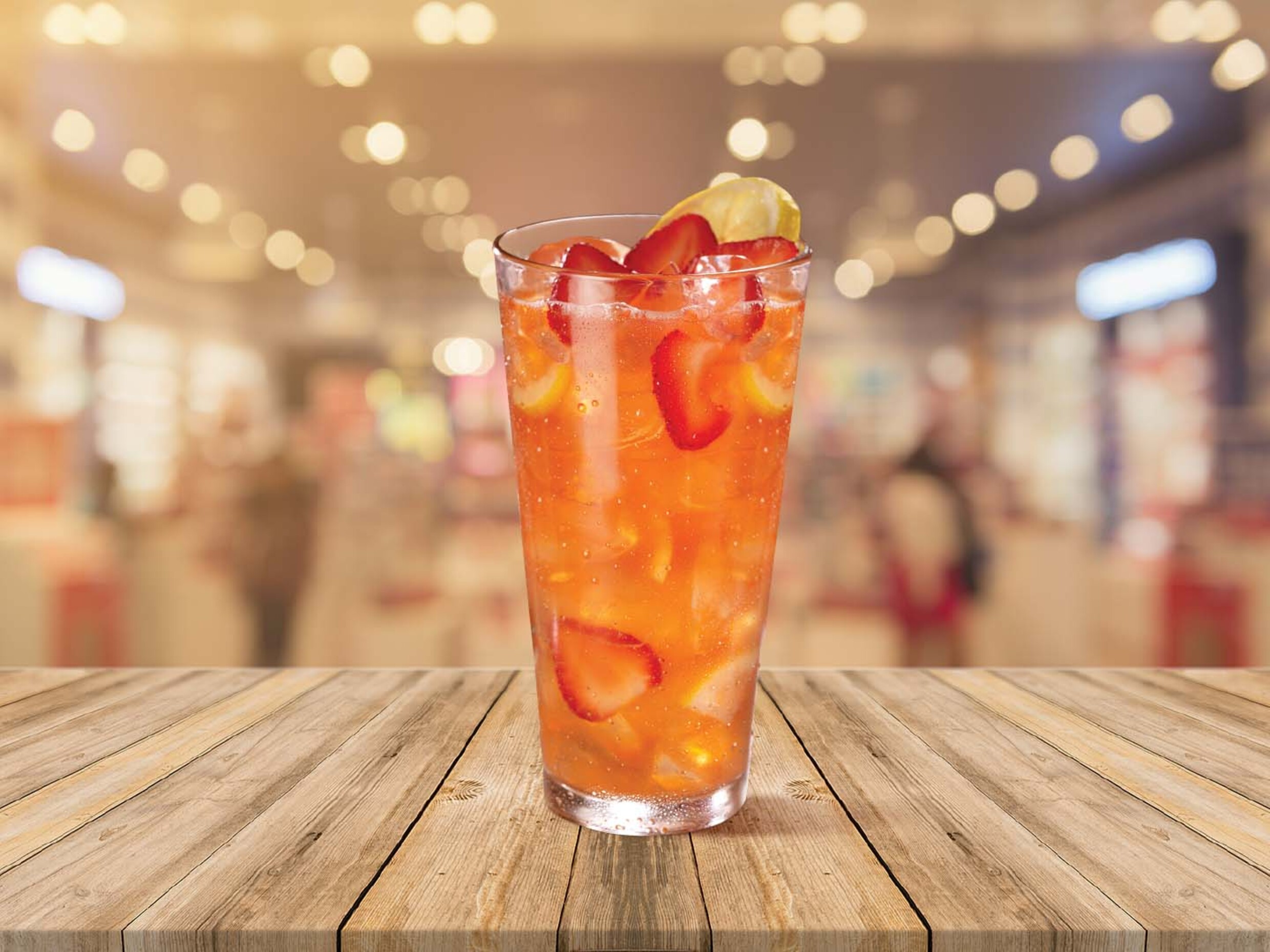 Ron blanco, fresas, hojas de menta fresca, soda y jugo de limón. Bebida servida sin hielo.