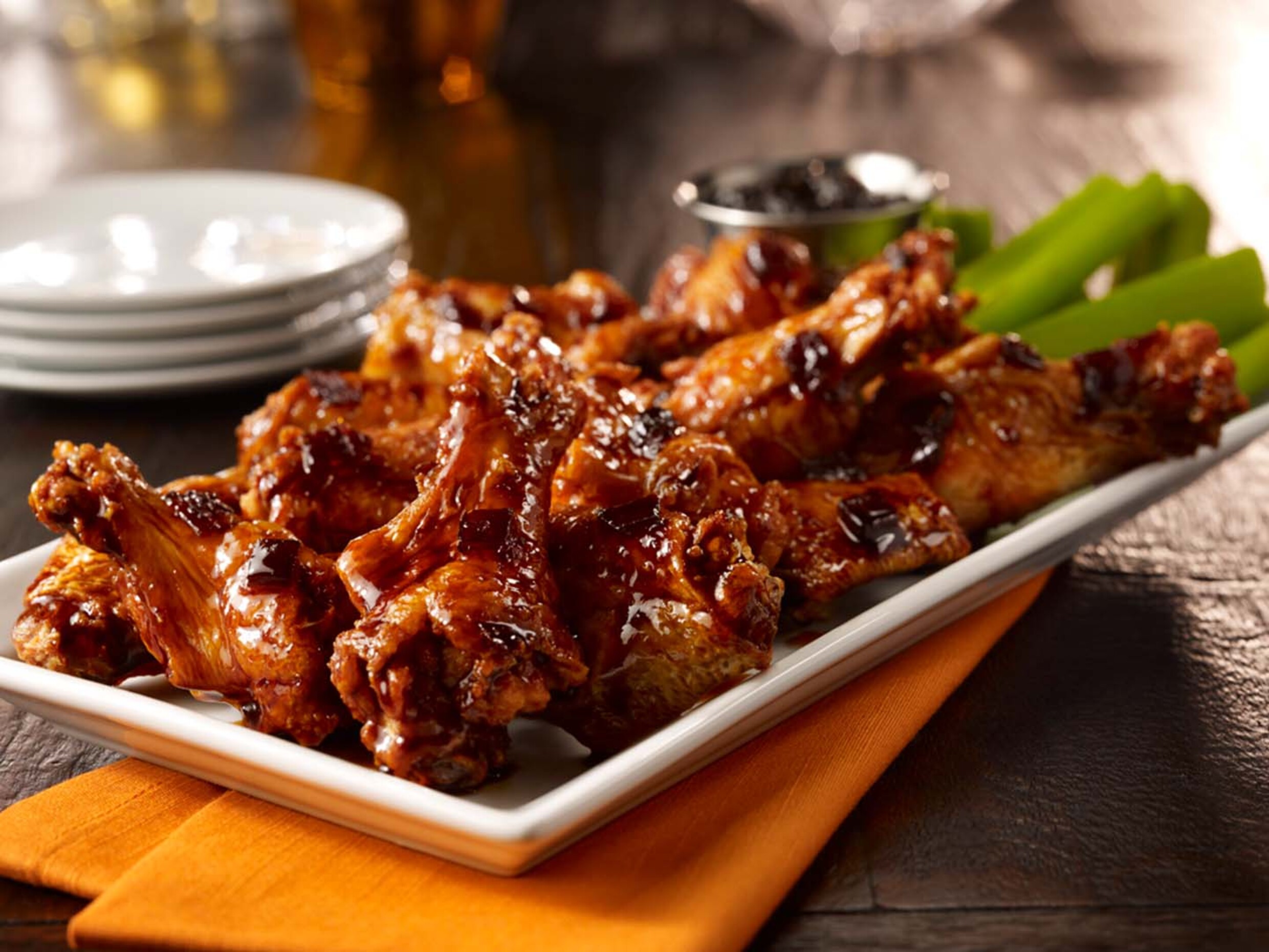 Alitas en salsa Fridays Whiskey Glaze, servidas con blue cheese dressing y bastones de apio.