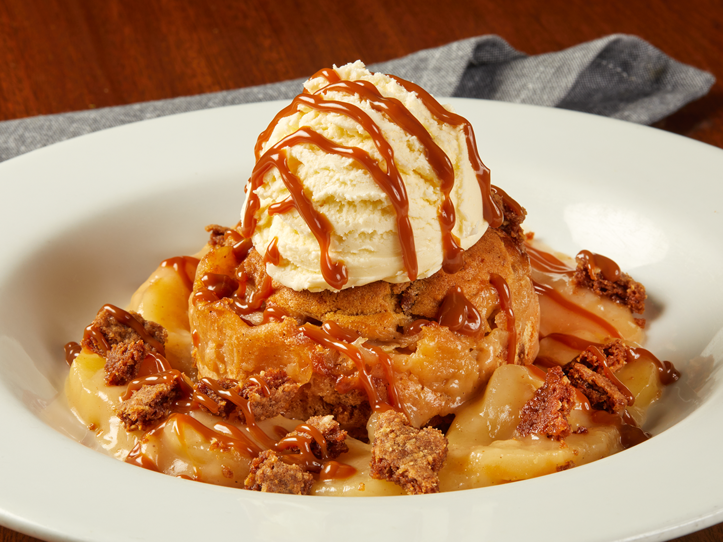 Deliciosa tarta de manzana sobre una base de compota de manzanas horneadas, granolas de canela y caramel sauce. Lo servimos con helado.
