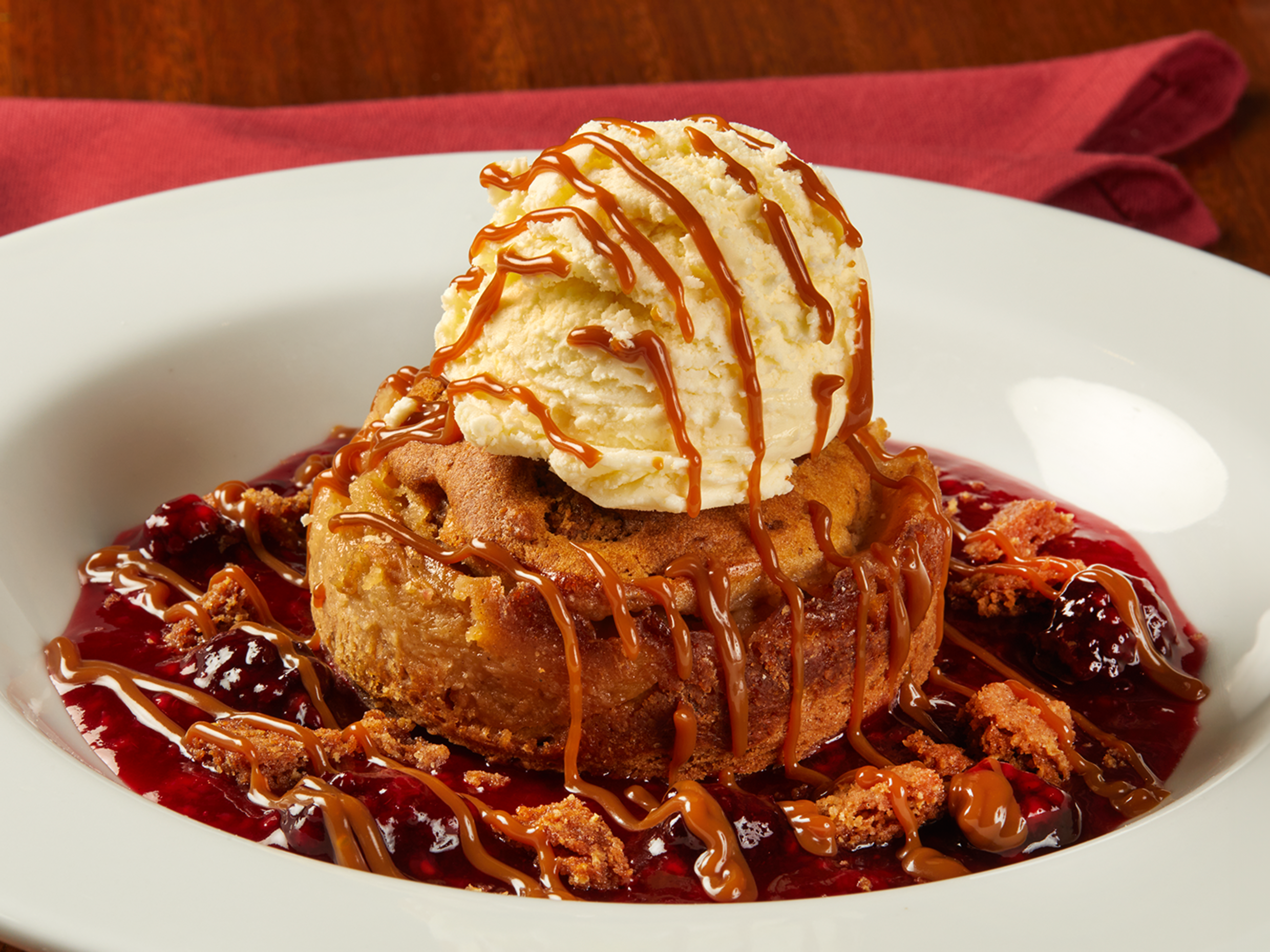 Deliciosa tarta de manzana sobre una base de coulis de frutos rojos (frambuesas y moras), granolas de canela y caramel sauce. Lo servimos con helado.