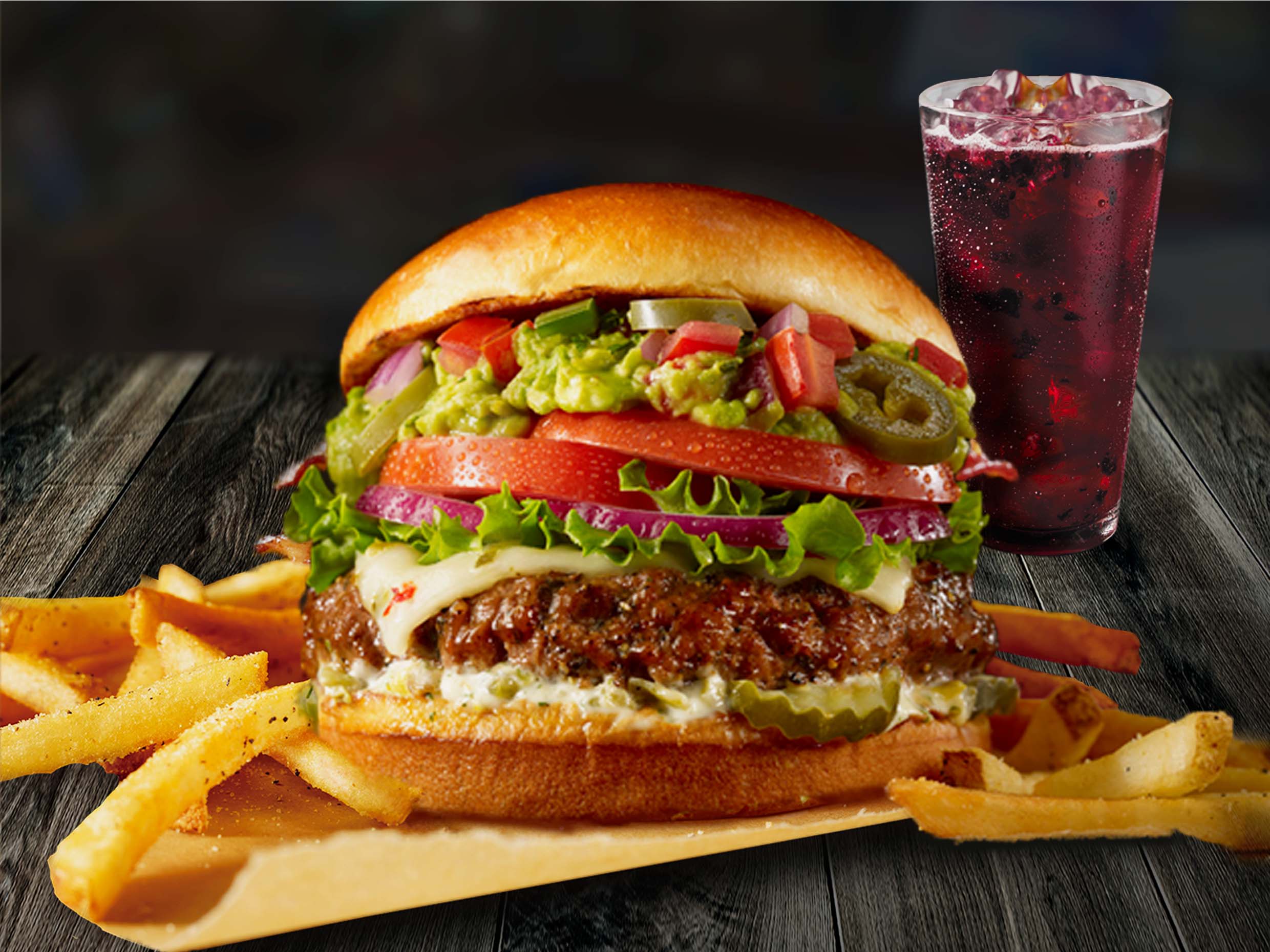 Hamburguesa de 200 gr. en término 3/4, queso pepper jack, guacamole, pico de gallo, jalapeños y acompañamiento a elección. Incluye bebida a elección.