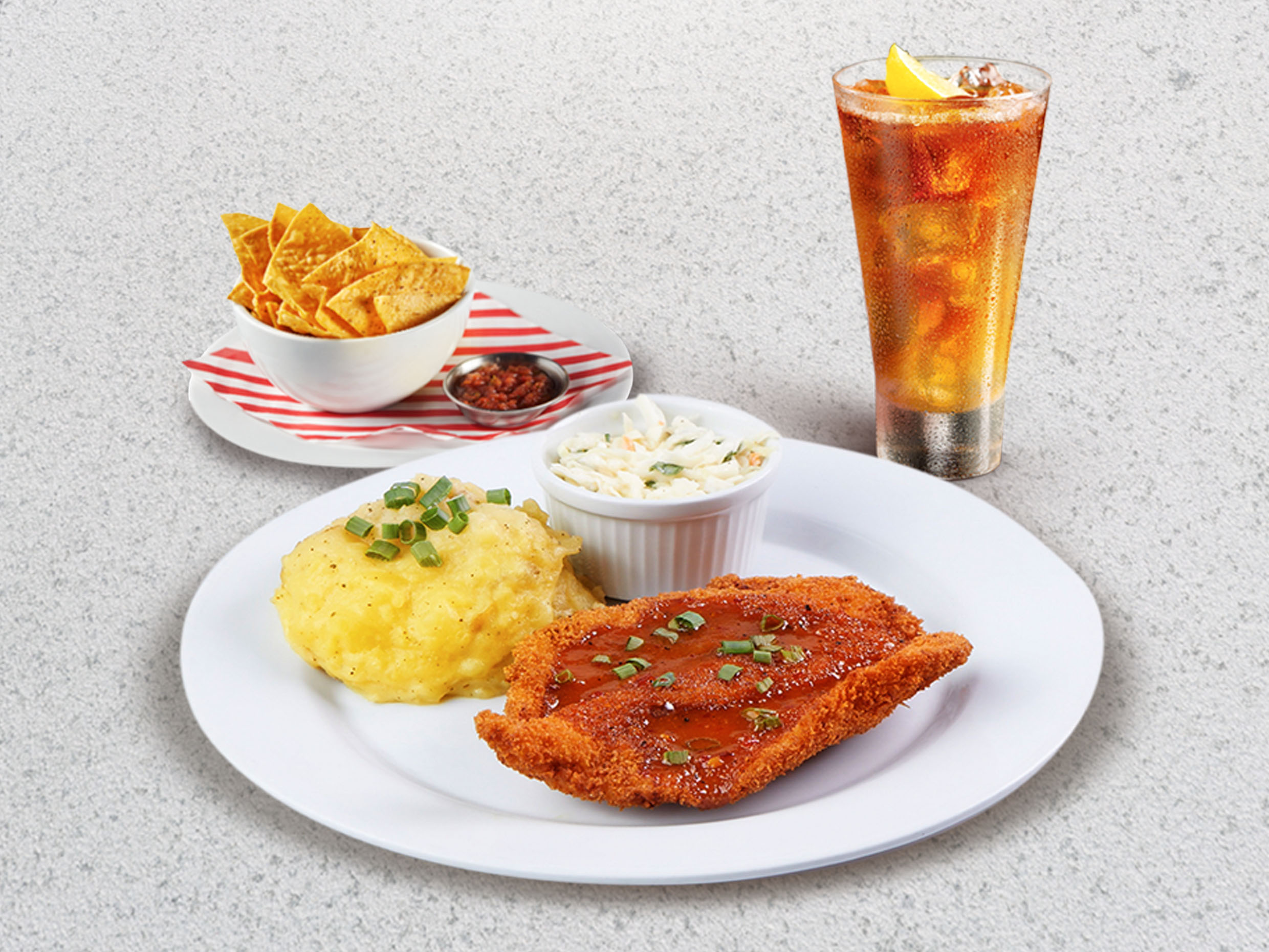 Pechuga de pollo empanizada con pan japones cubierta con salsa BBQ acompañada con pure de papas y coleslaw. Incluye entrada y bebida.