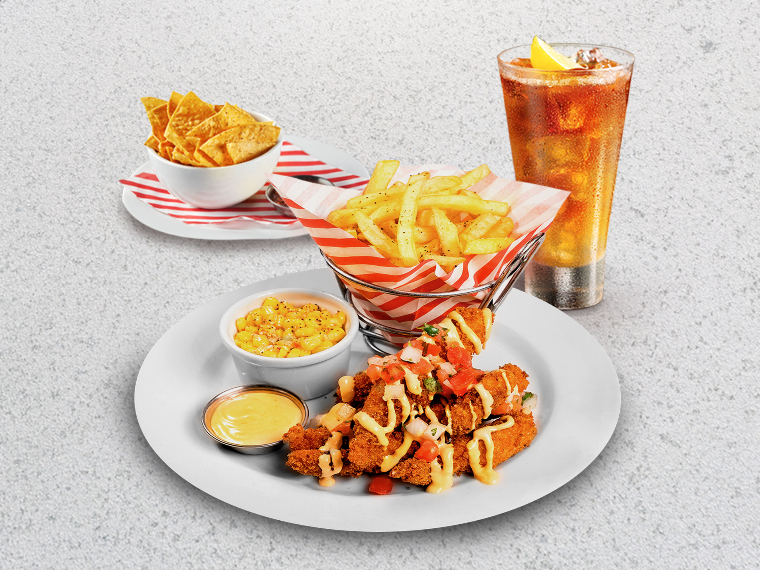 Crujientes lomitos de pechuga de pollo empanizados con panko, bañados en salsa mayo BBQ y montados con pico de gallo. Servidos con choclo americano y papas fritas. Incluye entrada y bebida.