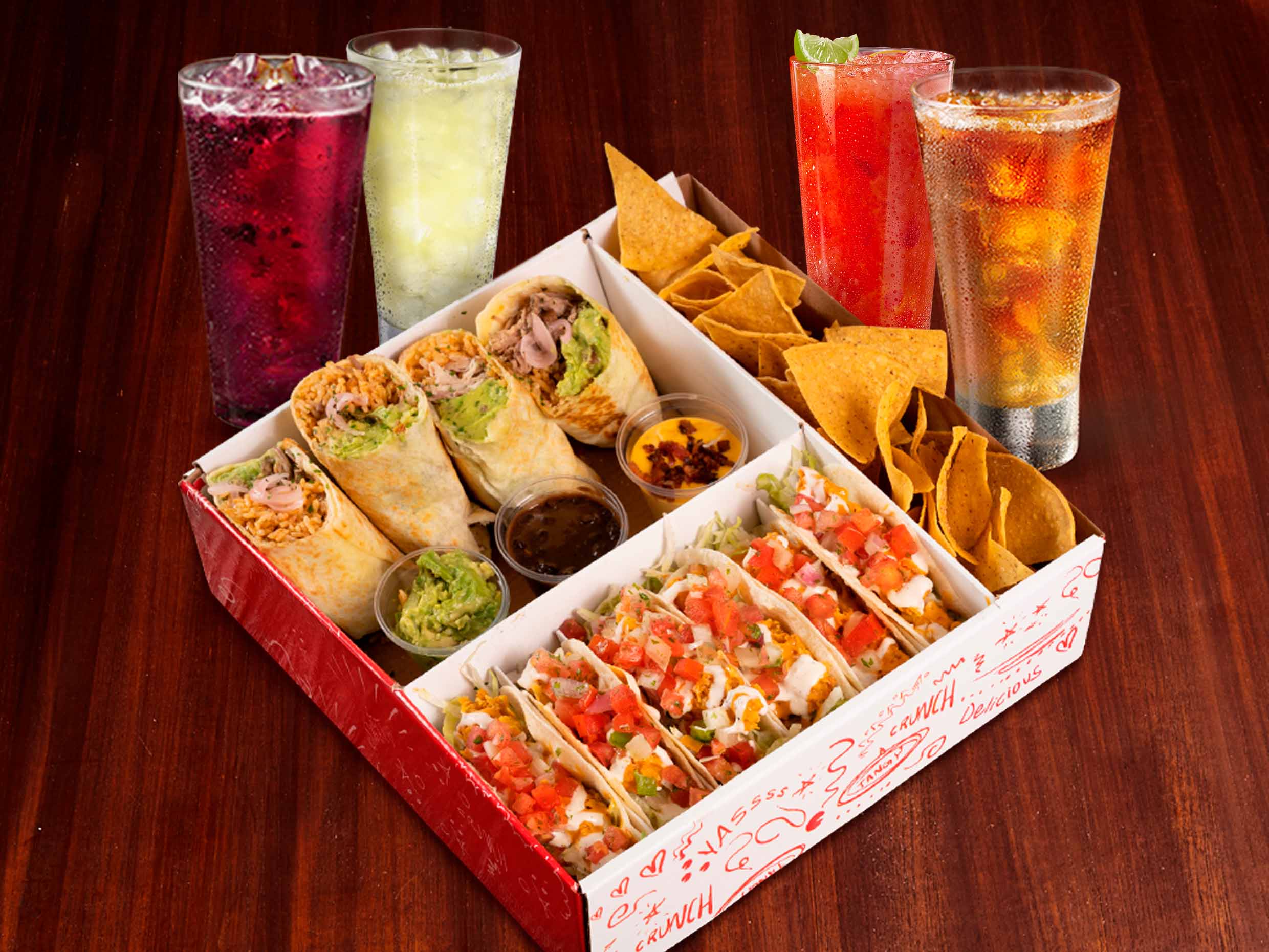 6 Chicken Tacos, 1 Chicken BBQ Burrito y 1 Beef Burrito. Acompañado con chips, frejoles de la casa, guacamole y salsa de queso con trocitos de tocino.