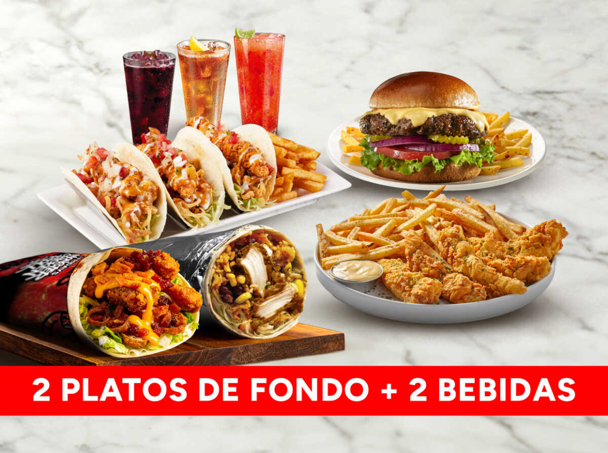 Escoge 2 platos entre Chicken BBQ Burrito, Cheese Burger, Pasta o Chicken Fingers y 2 Bebidas.