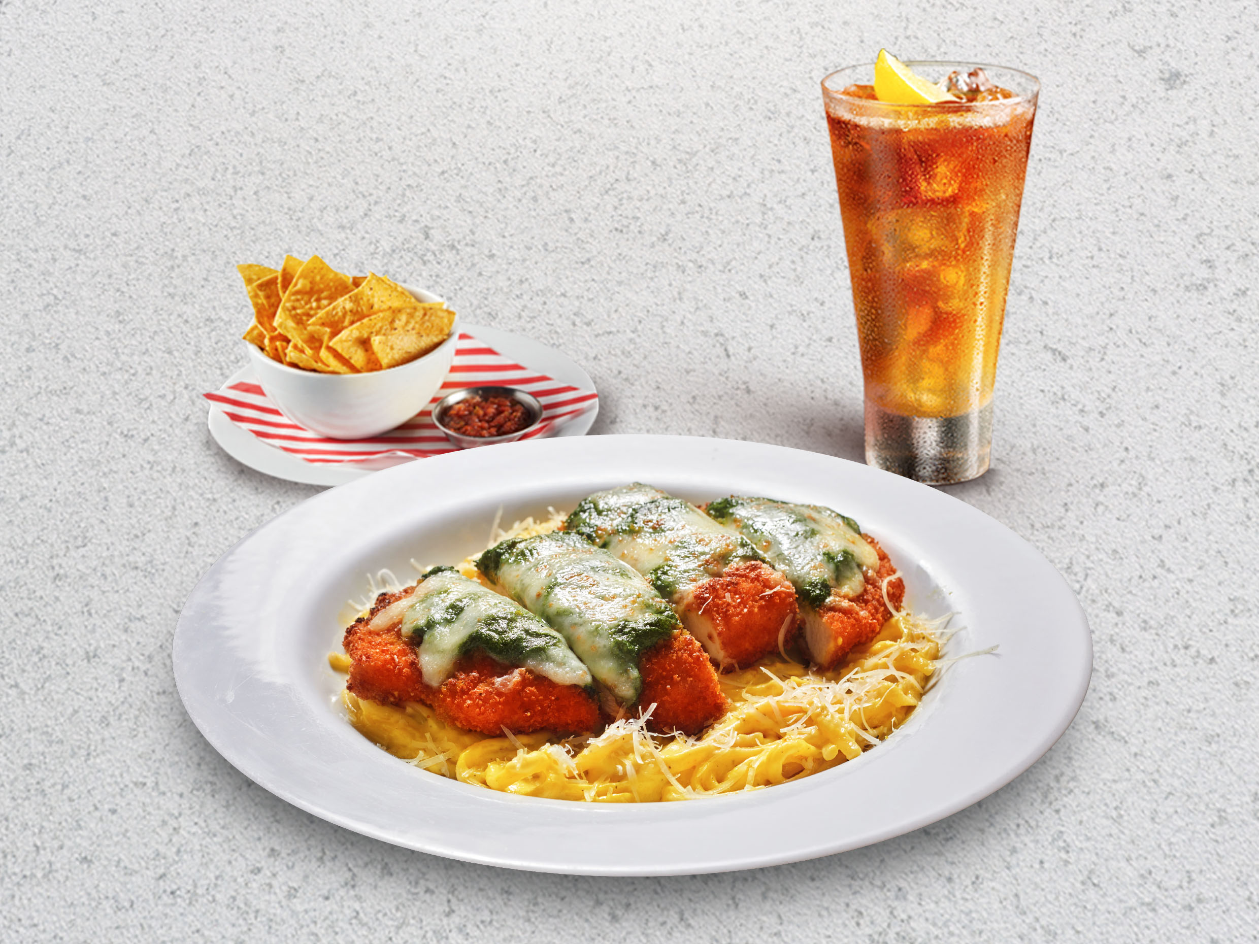 Cremosos tallarines en salsa a la huancaína, servido con milanesa de pollo gratinada con pesto y queso mozzarella. Incluye entrada y bebida.