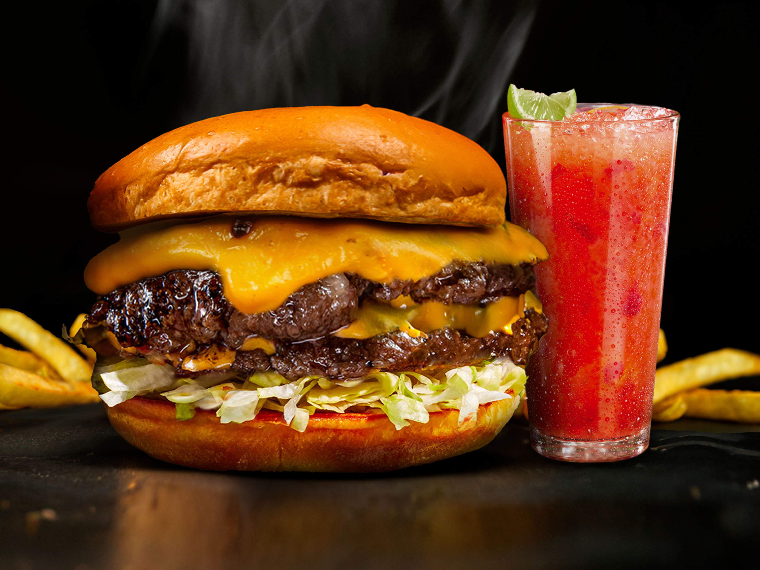 Doble hamburguesa estilo smashed de 80gr cada una, con tocino, doble queso cheddar, lechuga y salsa especial. Viene acompañado de papas fritas.