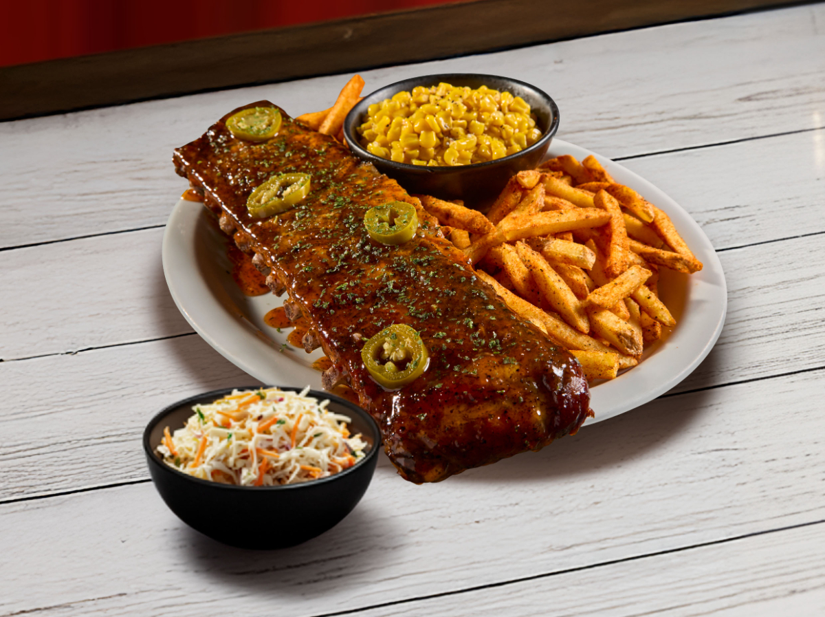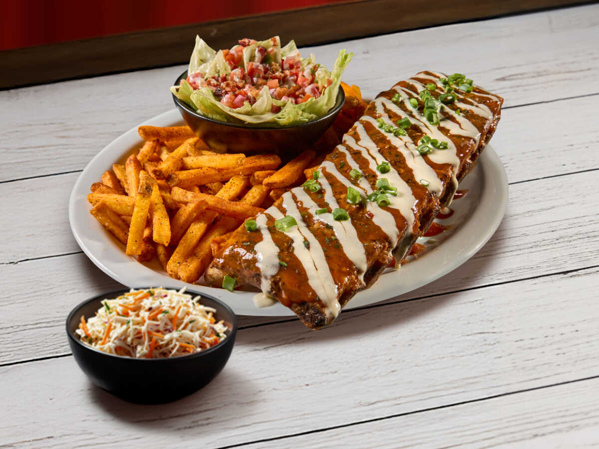Costillas de cerdo bañadas en salsa Hot BBQ y servidas con papas fritas sabor cajún y ensalada bañada en aderezo bleu cheese y tocino crujiente.