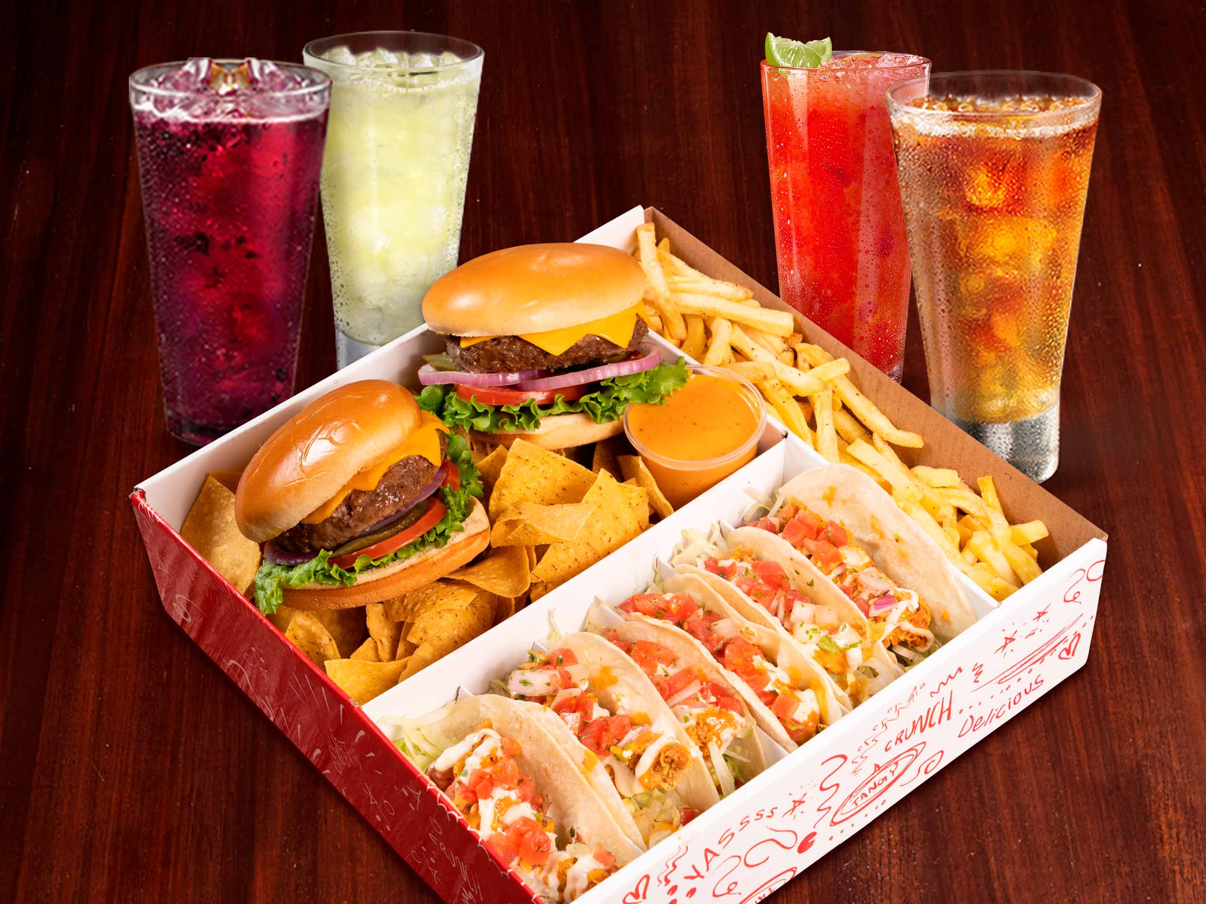6 Chicken Tacos, 2 Fridays Cheeseburger (término 3/4). Acompañado con chips, papas fritas y mayo BBQ.