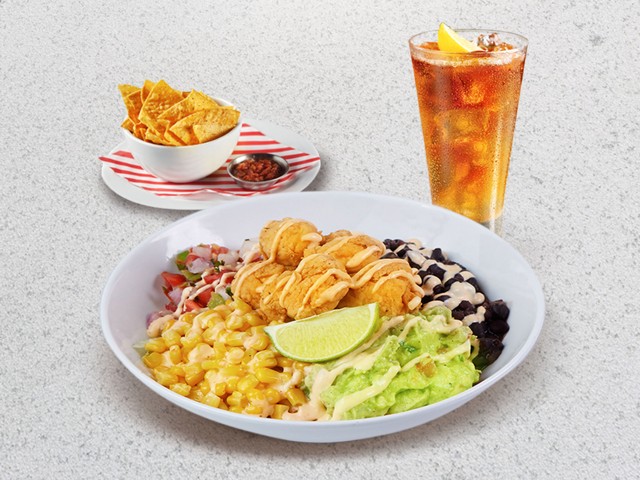 Crujientes lomitos de pechuga de pollo empanizados, base de lechuga cortada en tiras, arroz sazonado con especies, choclo americano, frejoles de la casa, pico de gallo, guacamole y alioli sriracha. incluye entrada y bebida.