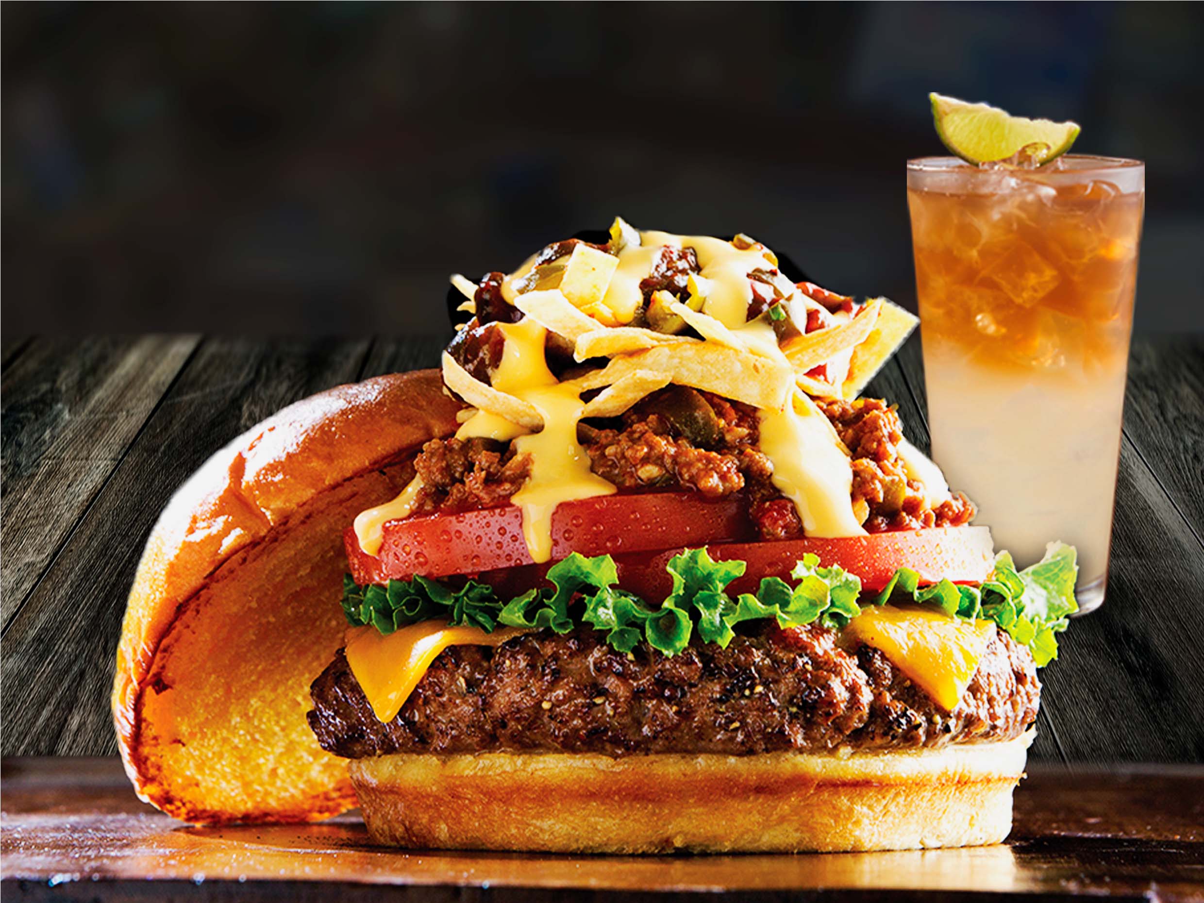 Hamburguesa de 200 gr. en término 3/4 con chili meat, queso fundido, tiritas de tortilla de maíz y spice relish jalapeño. acompañada con papas fritas. Incluye bebida a elección.