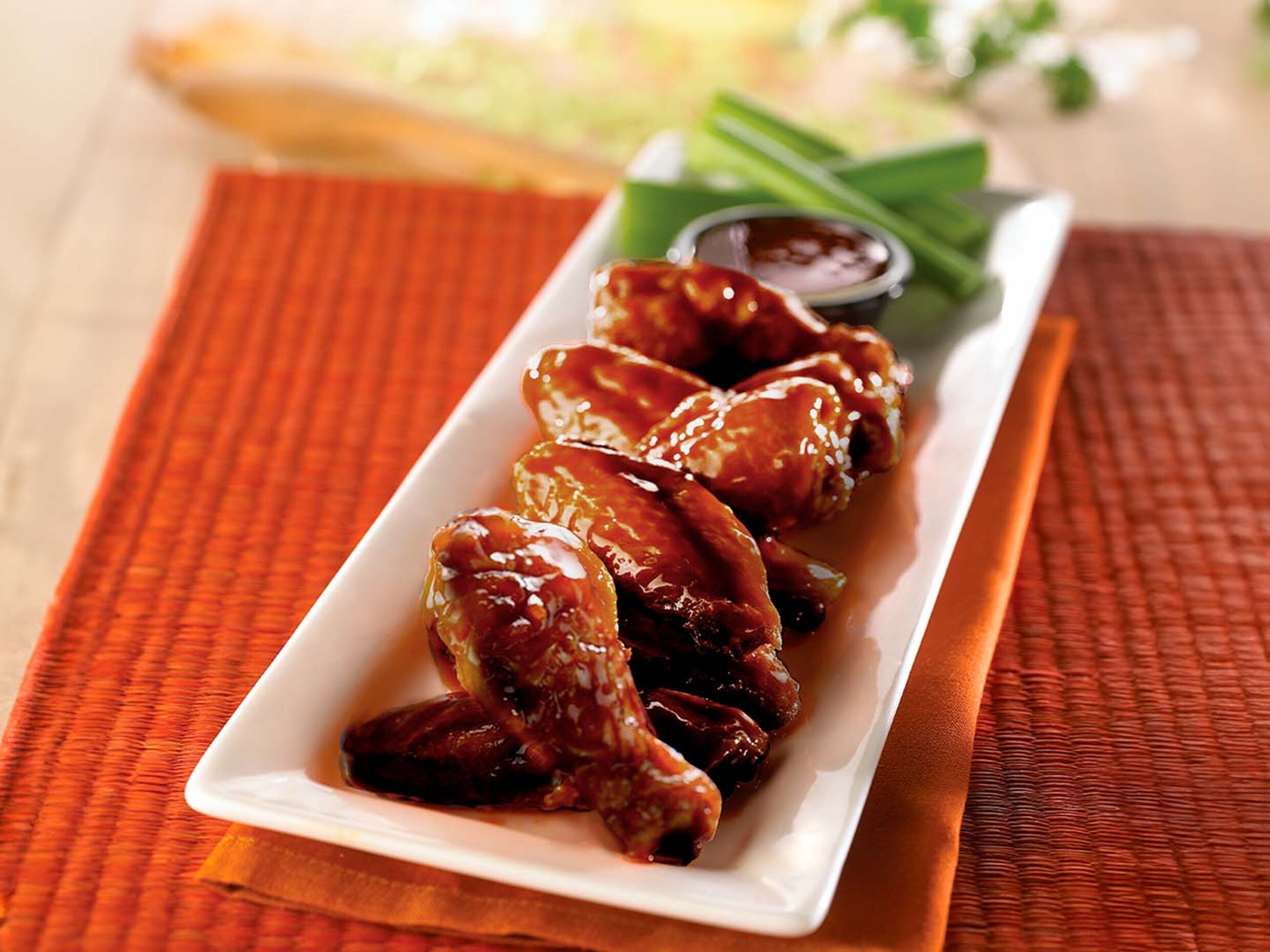 Alitas en salsa Fridays Whiskey Glaze, servidas con blue cheese dressing y bastones de apio.