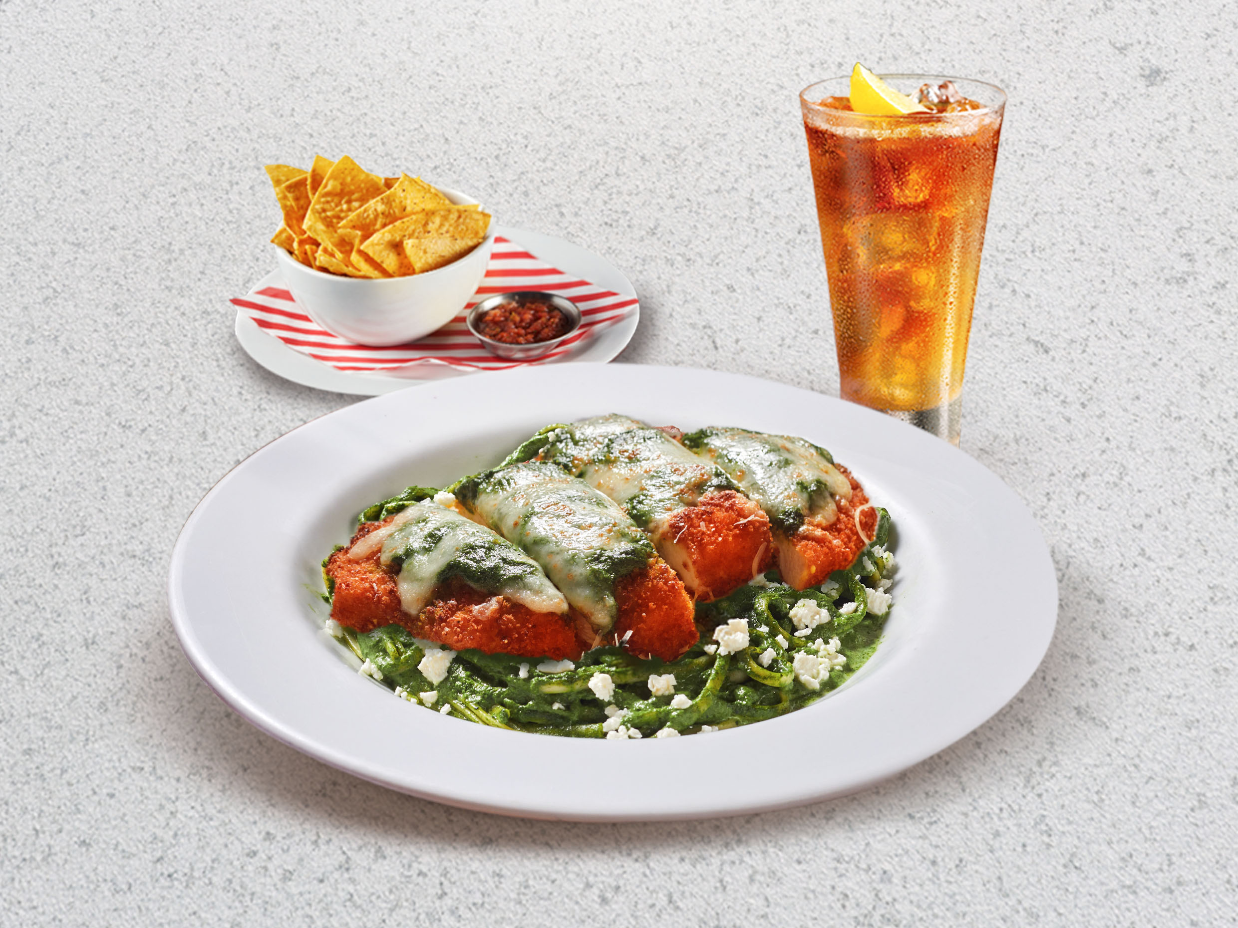Clásicos tallarines en salsa de espinaca y albahaca, acompañado con milanesa de pollo. Incluye entrada y bebida.