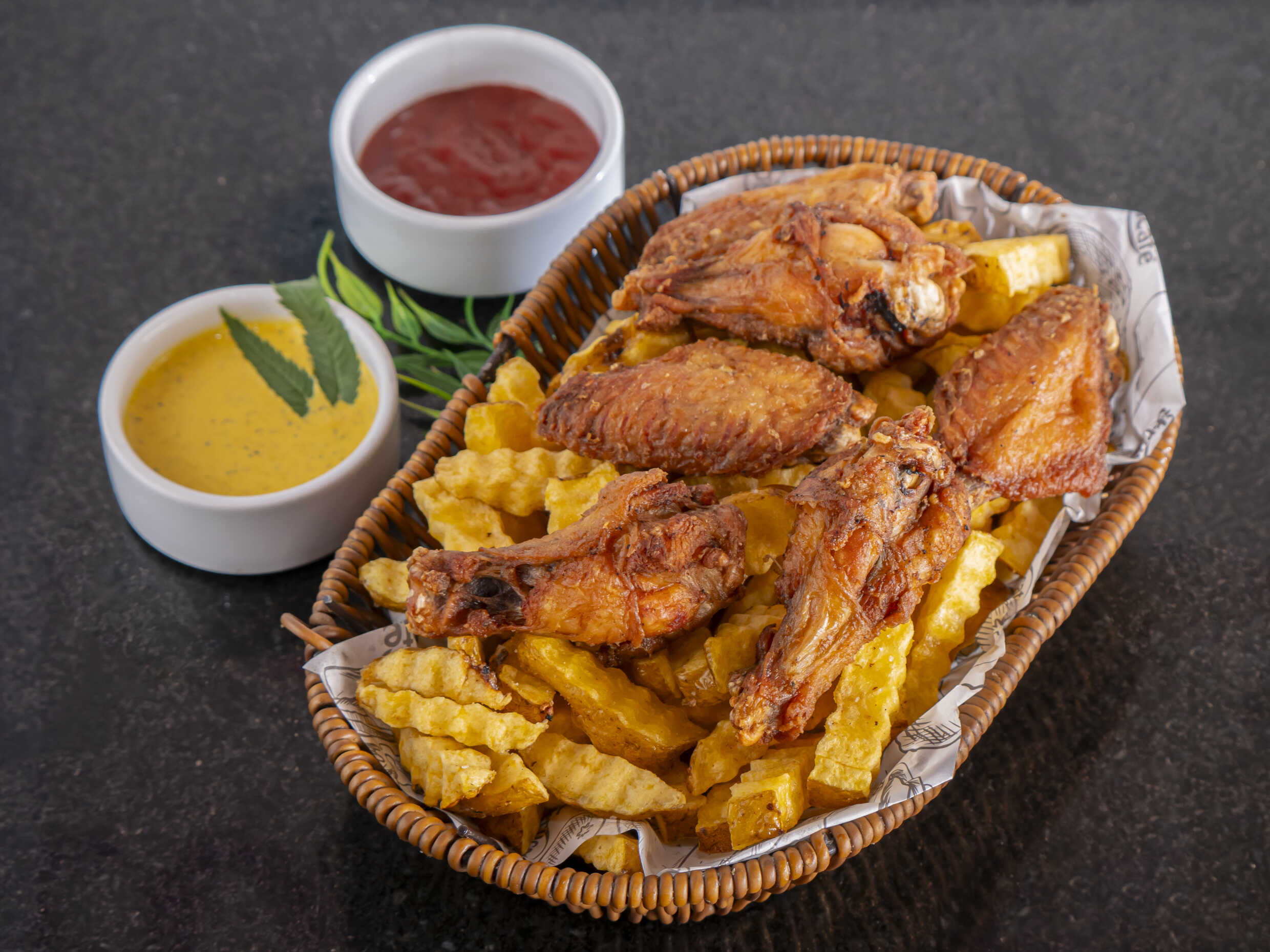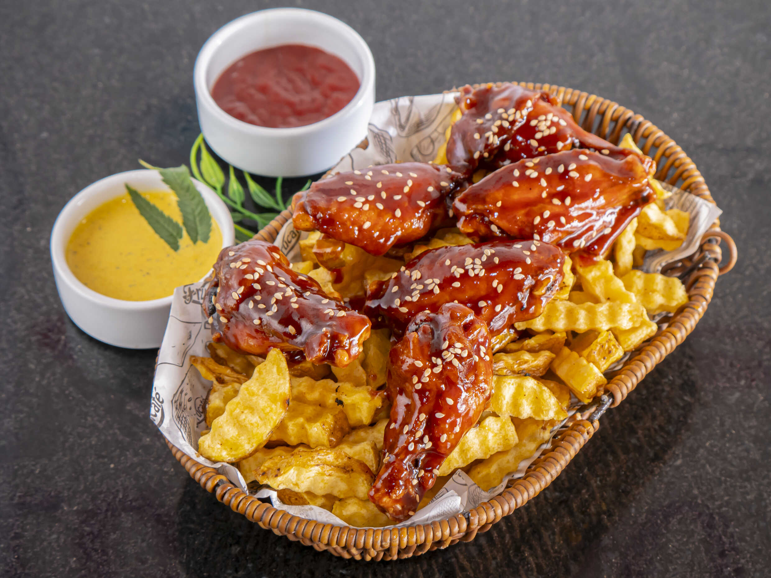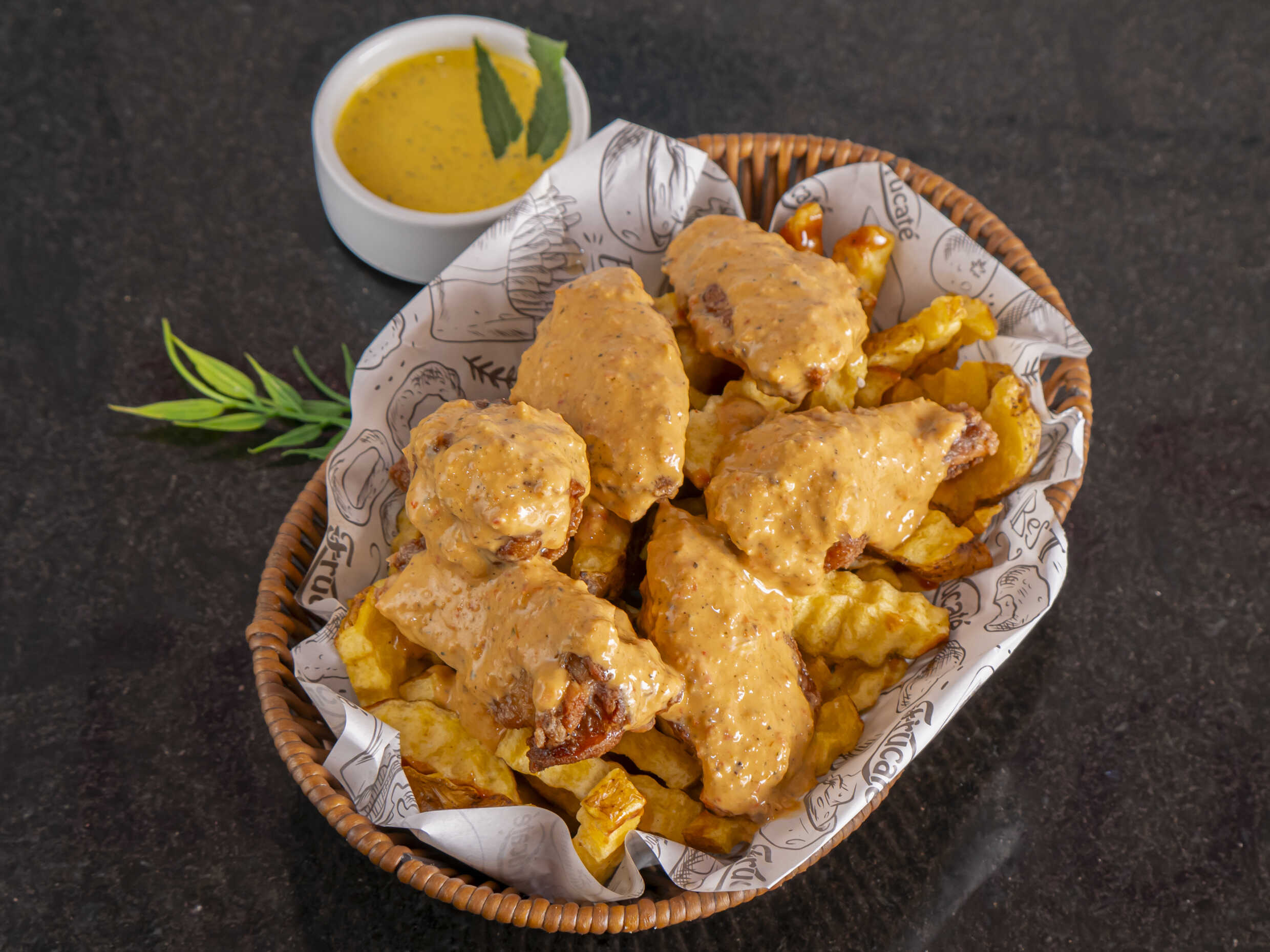 6 Piezas de pollo, bañadas en salsa BBQ ahumada, acompañadas de papas amarillas crocantes.