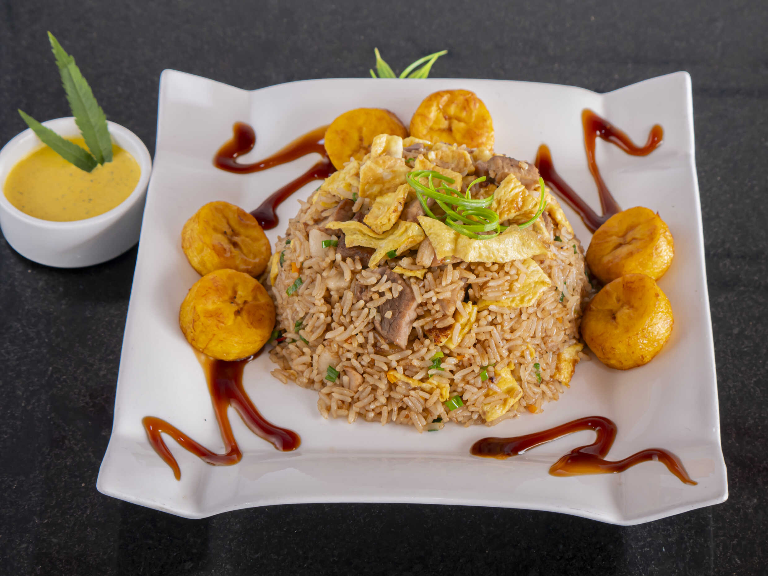 Arroz frito con verduras, cebolla china, tortilla de huevo, trozos y chancho salteado, todo al wok, acompañado de plátano maduro fritos.