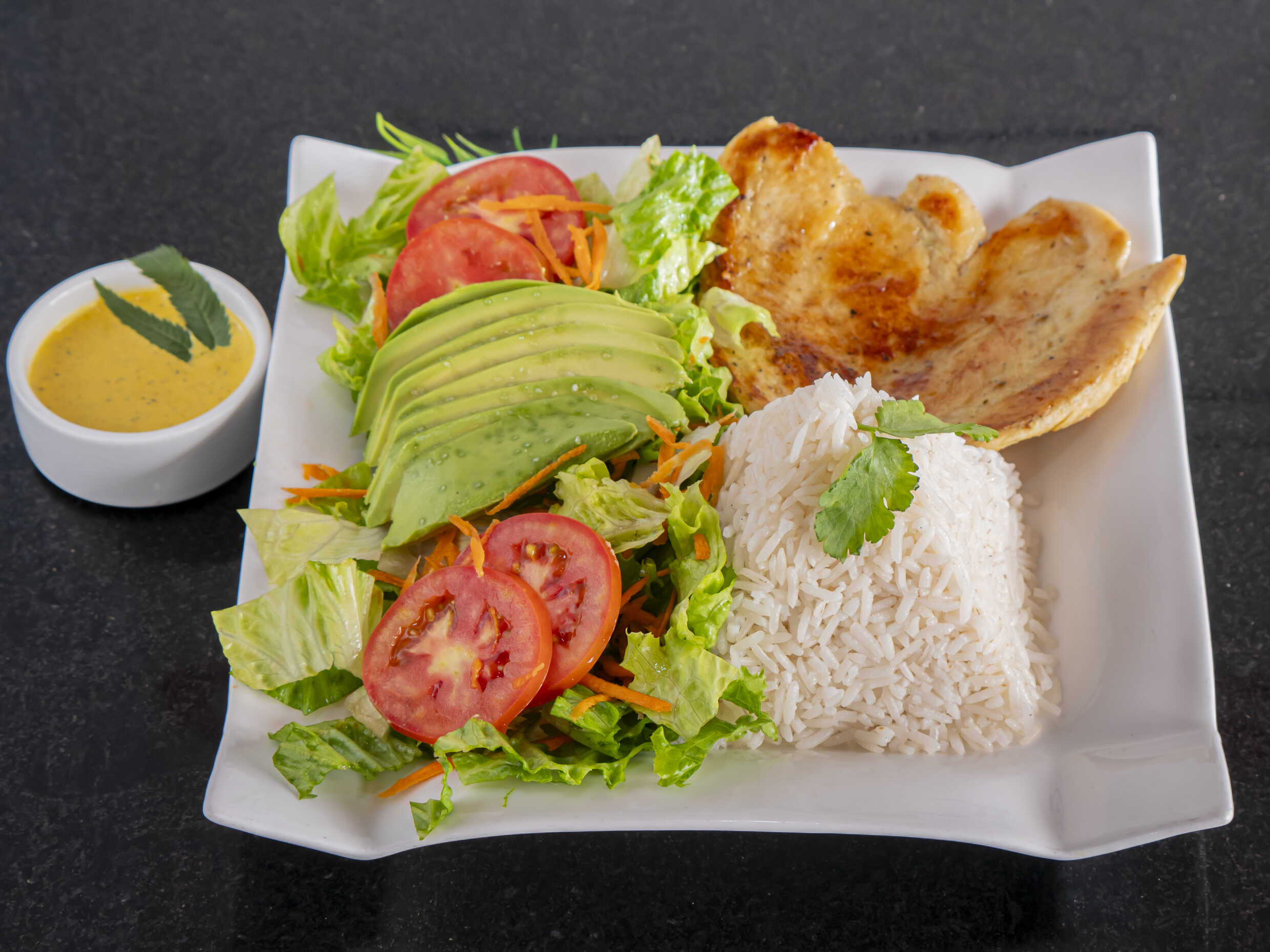 Filete de pechuga a la plancha, acompañado de arroz blanco y abundante ensalada fresca.