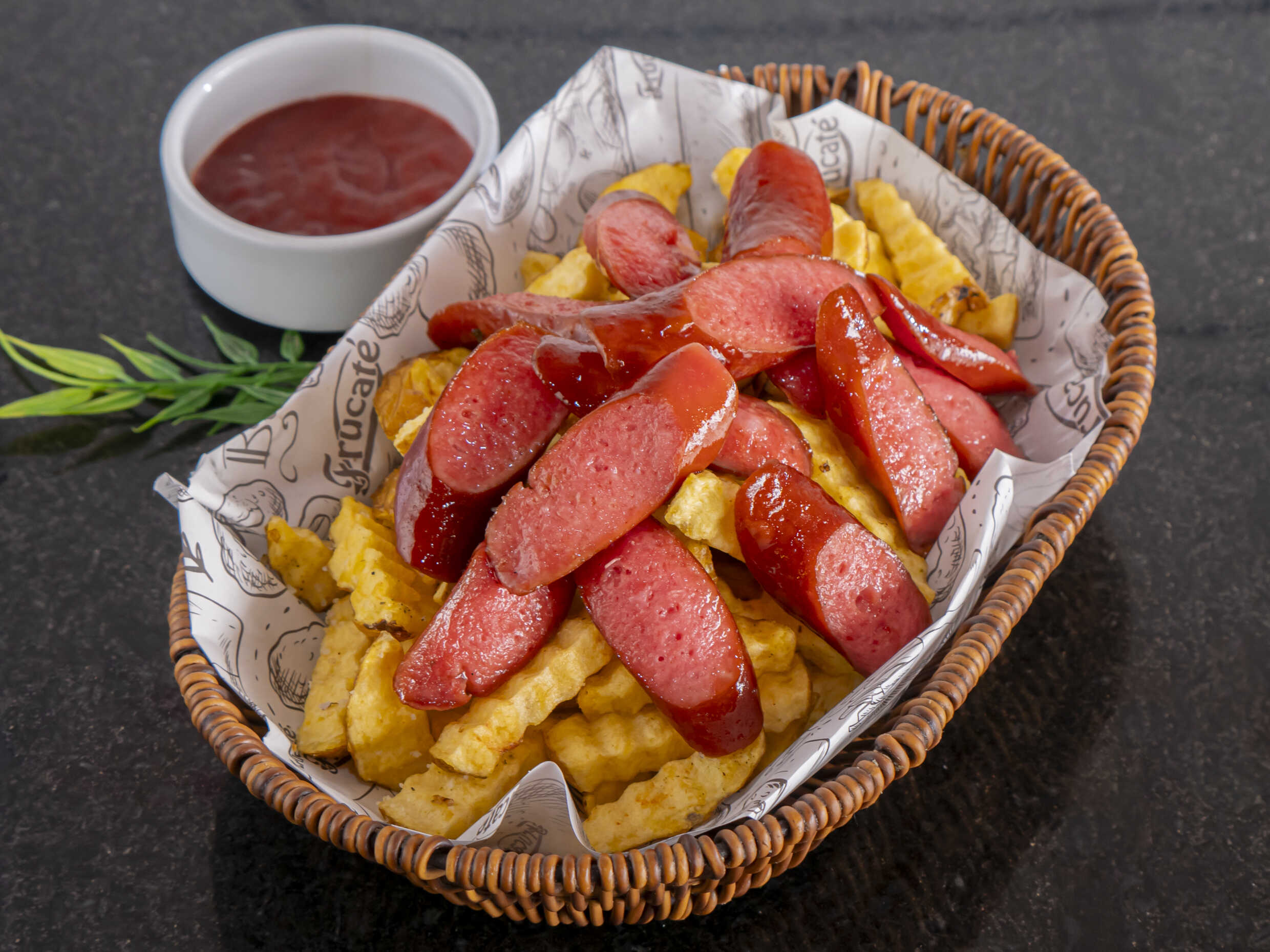 Salchicha ahumada, acompañada de papas amarillas fritas y cremas al gusto.