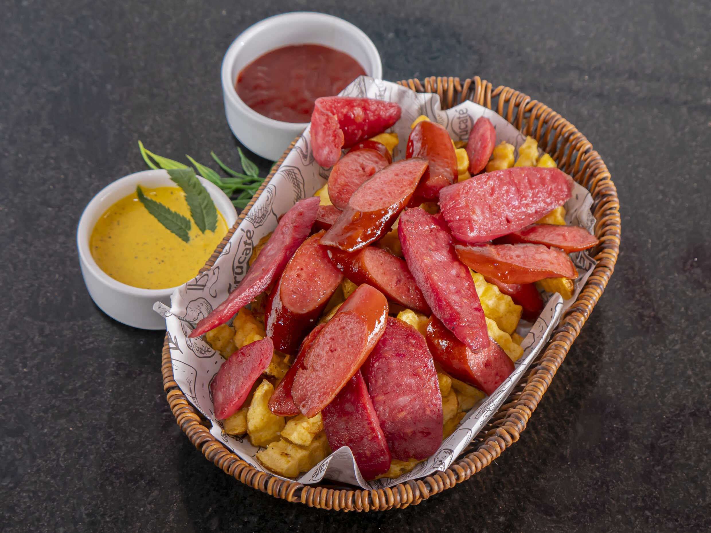 Salchicha ahumada, chorizo parrillero, acompañado de papas amarillas fritas y cremas al gusto.