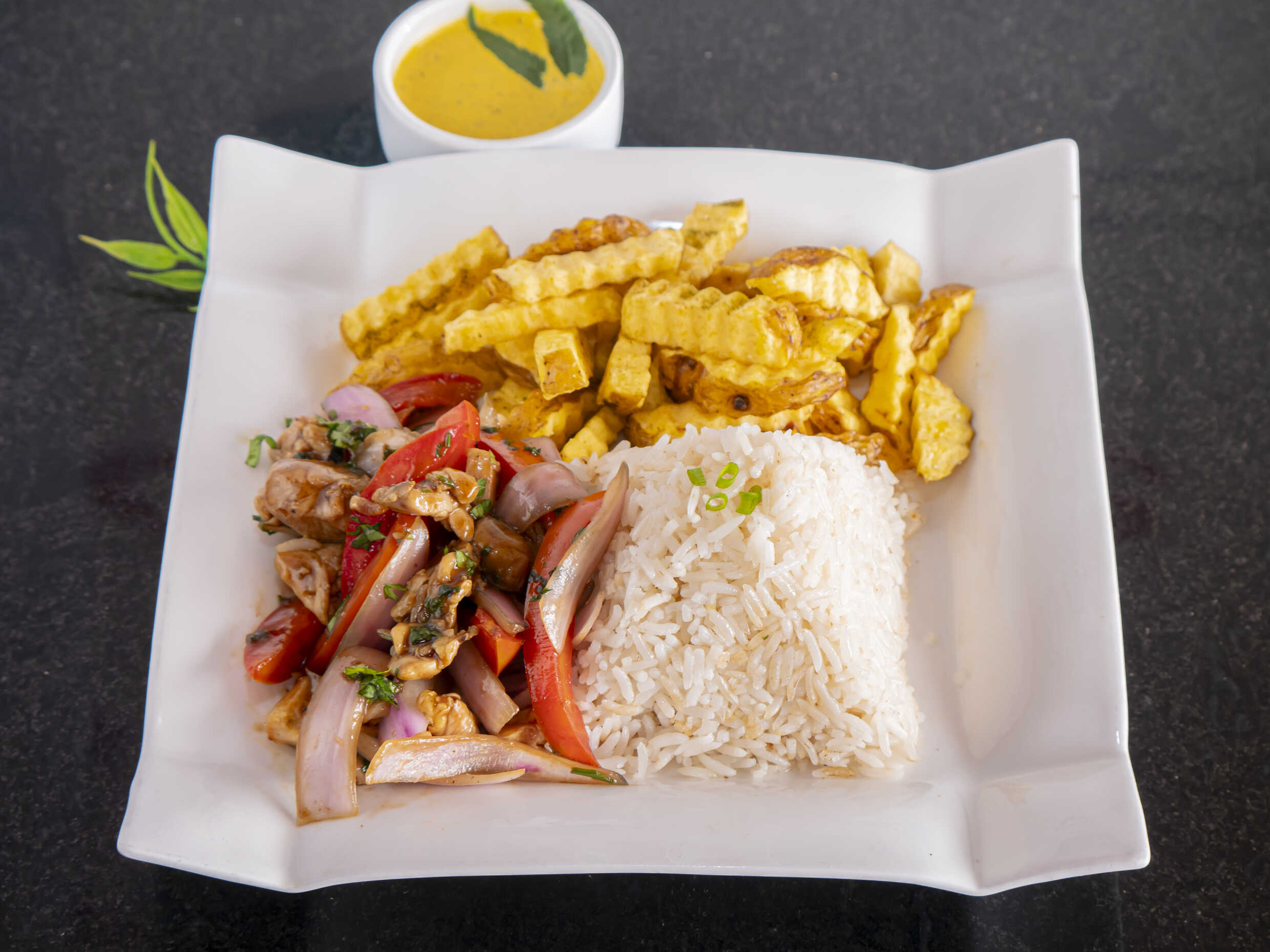 Lomo en trozos, salteado con cebolla y tomate con un toque de culantro, acompañado de papas amarillas fritas y arroz blanco.