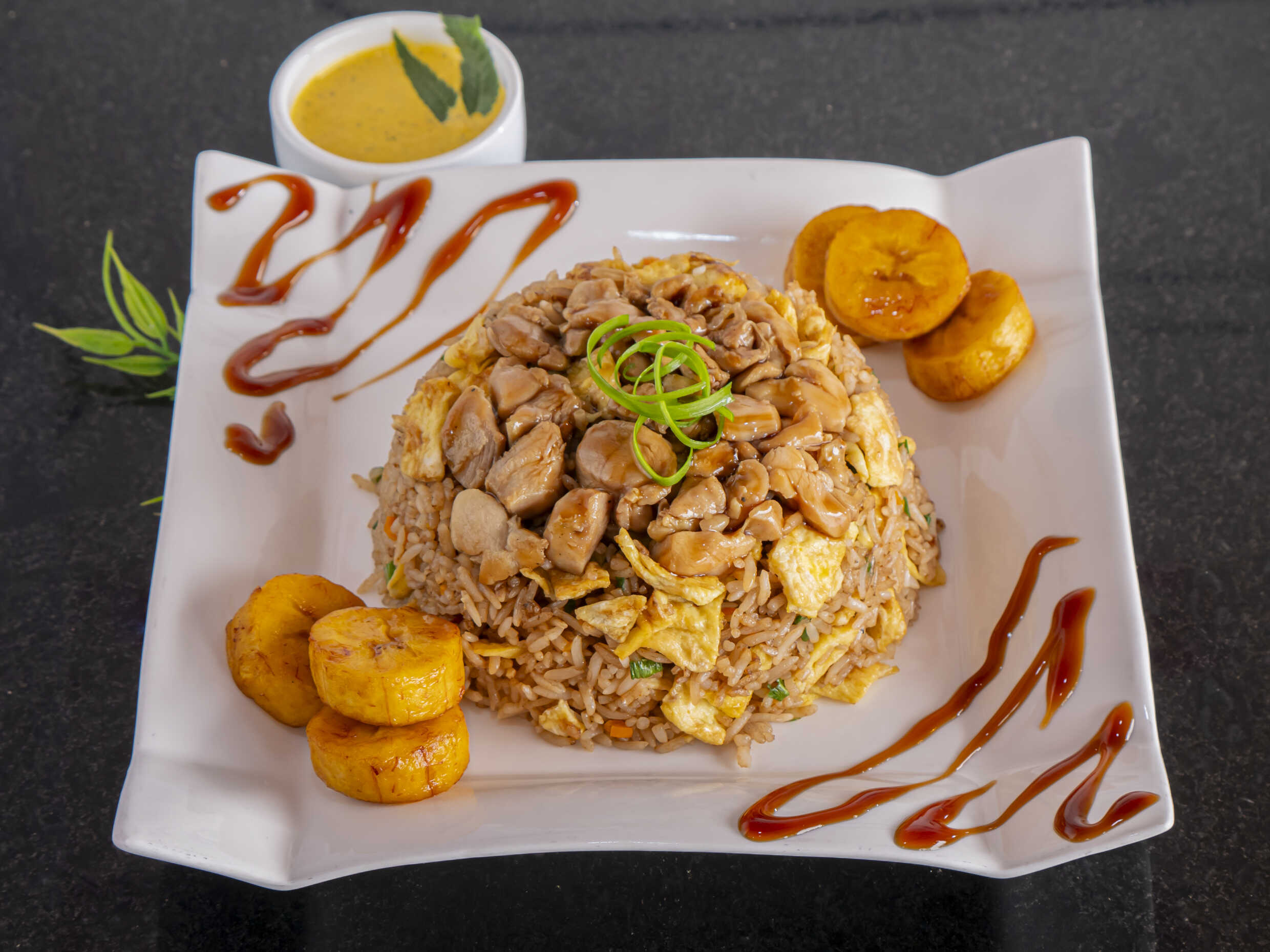 Arroz frito con verduras, cebolla china, tortilla de huevo, trozos y pollo salteado, todo al wok, acompañado de plátanos maduros fritos.