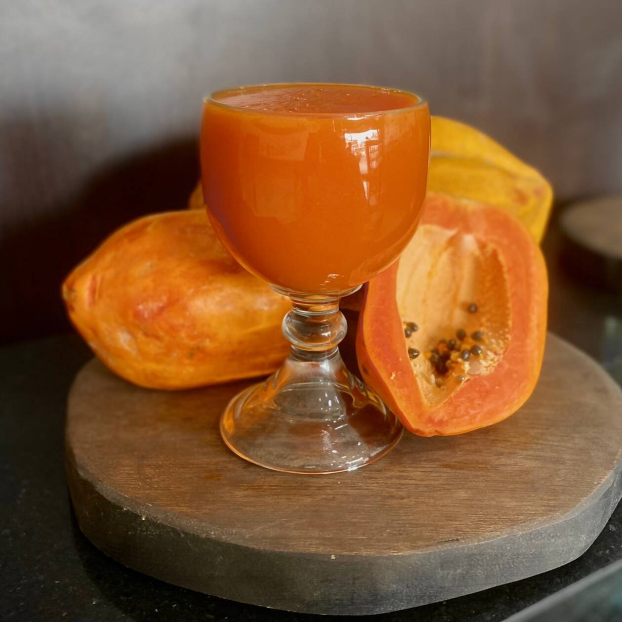 Papaya, plátano, leche, huevo, miel y algarrobina.