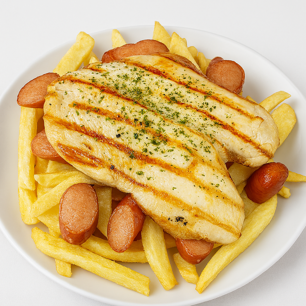 Pechuga a la plancha, hot dog, papas fritas y cremas a elección.