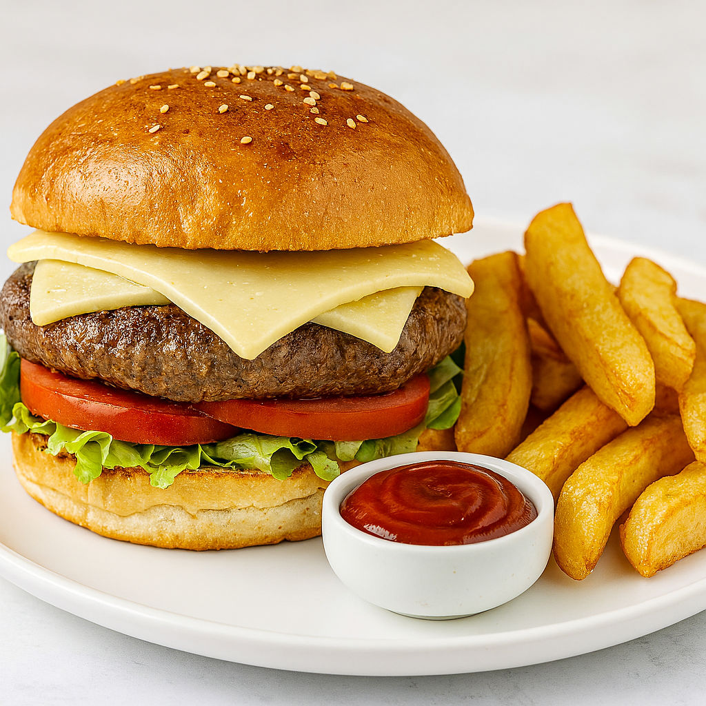 Carne artesanal, doble queso, papas fritas, tomate, lechuga y cremas a elección.