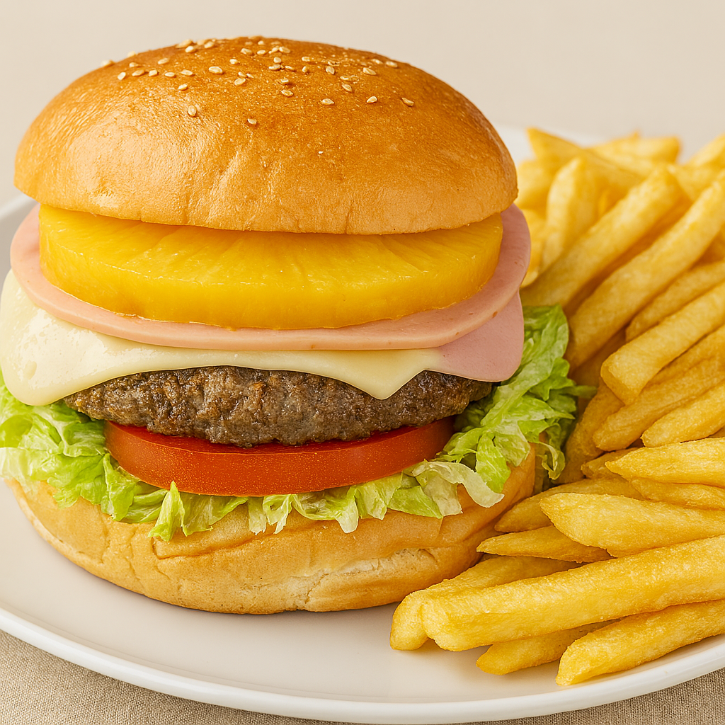 Carne artesanal, jamón, queso, piña, papas fritas, tomate, lechuga y cremas a elección.