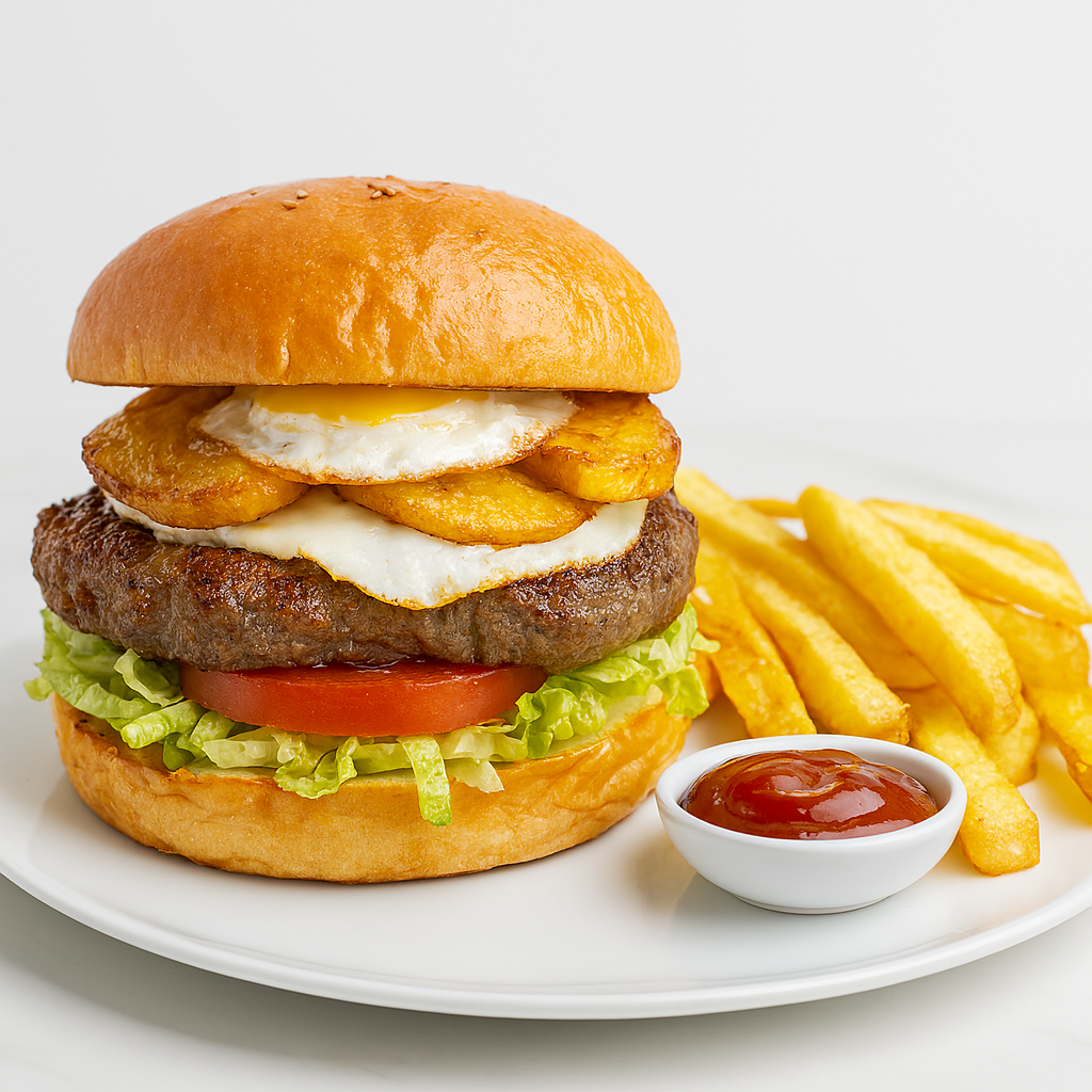 Carne artesanal, plátano, huevo, papas fritas, tomate, lechuga y cremas a elección.
