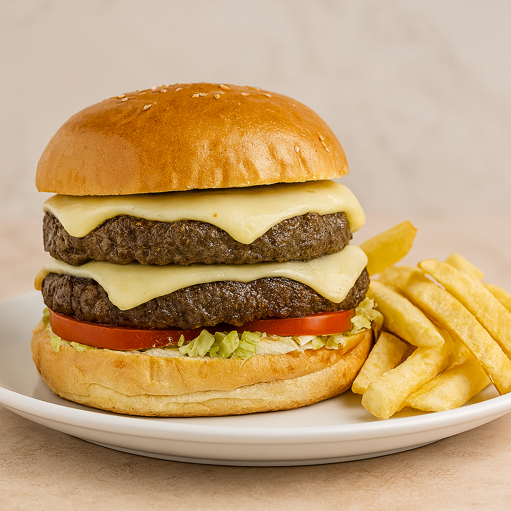 Doble carne artesanal, doble queso, papas fritas, lechuga, tomate y cremas a elección.
