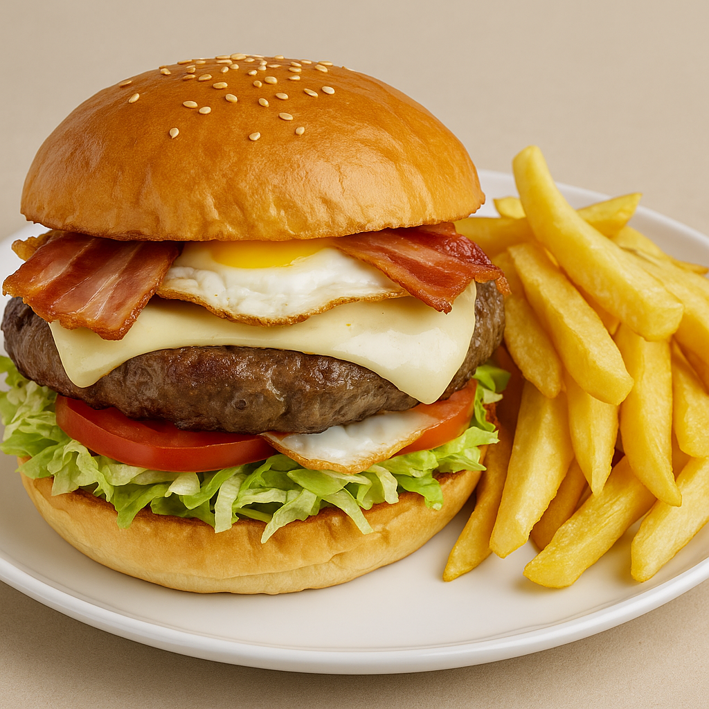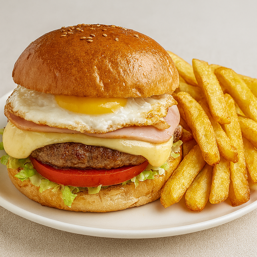 Carne artesanal, huevo, jamón, queso, papas fritas, tomate, lechuga y cremas a elección.