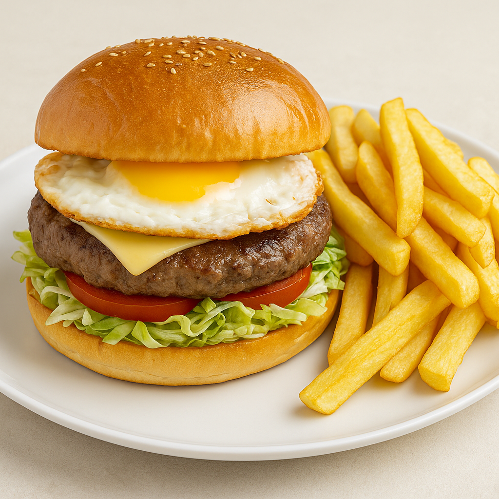 Carne artesanal, huevo, queso, papas fritas, tomate, lechuga y cremas a elección.