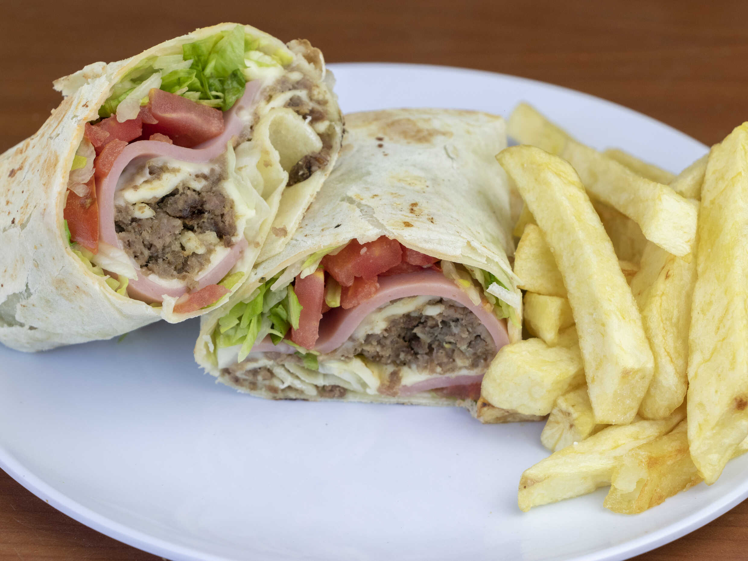 Tortilla de trigo, carne, jamón, queso, lechuga, tomate y papas fritas.