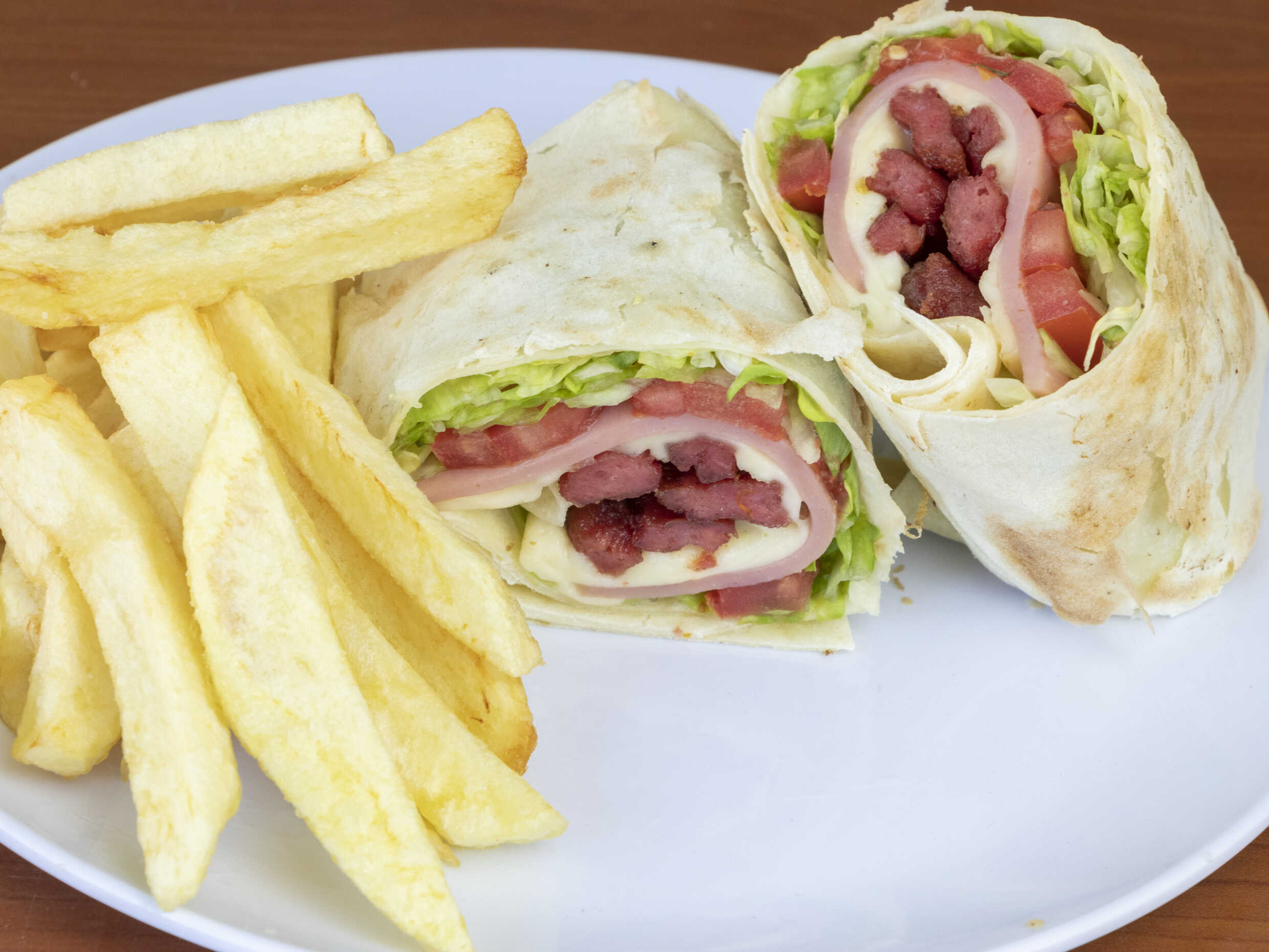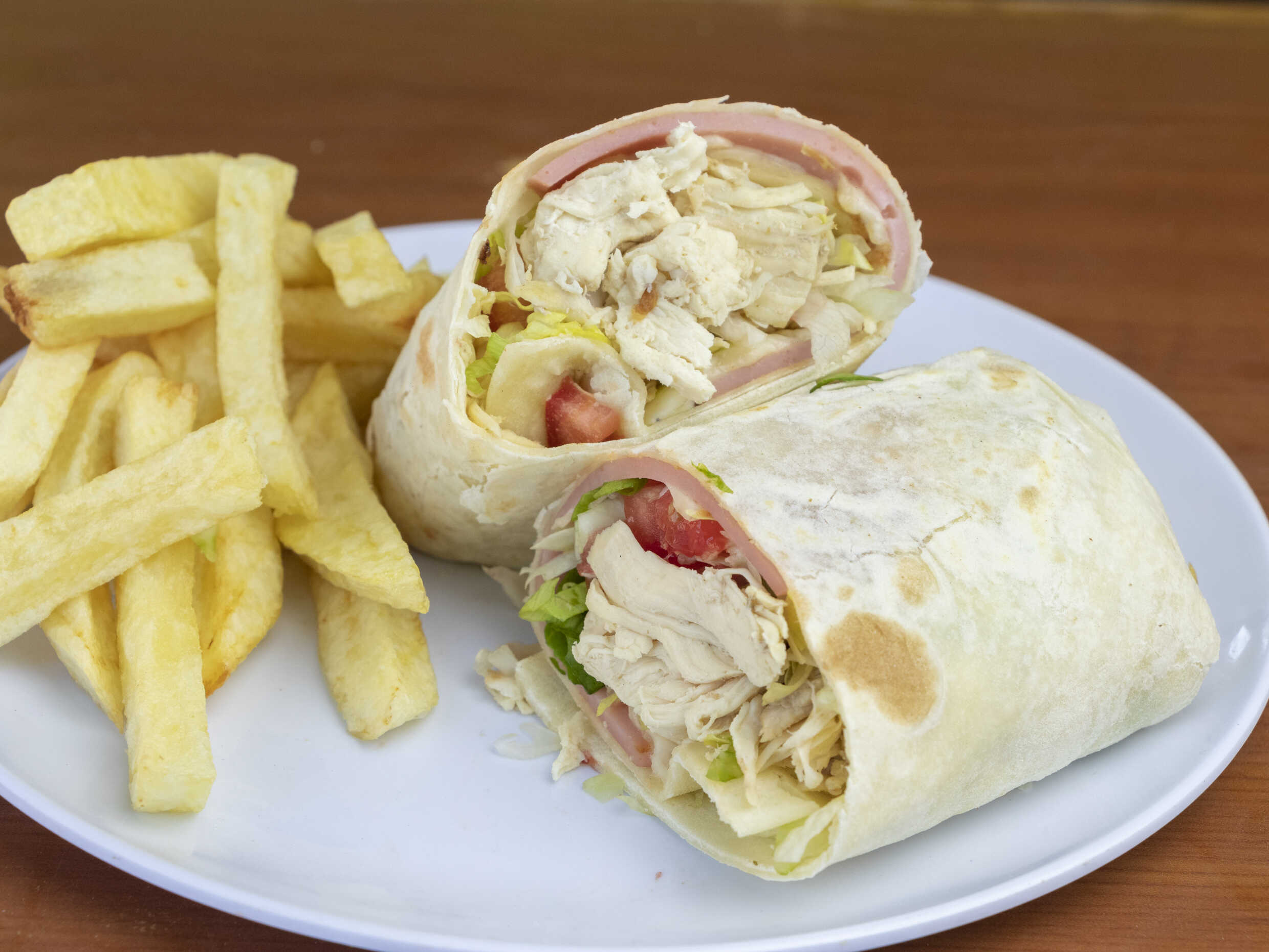 Tortilla de trigo, pollo deshilachado, jamón, queso, lechuga, tomate y papas fritas.