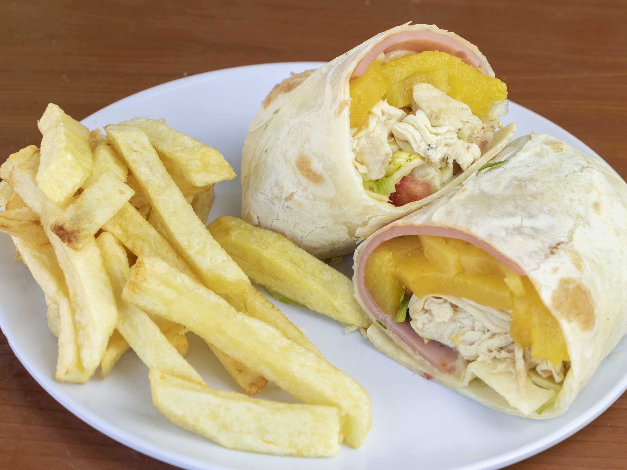 Tortilla de trigo, pollo deshilachado, jamón, queso, piña, lechuga, tomate y papas fritas.