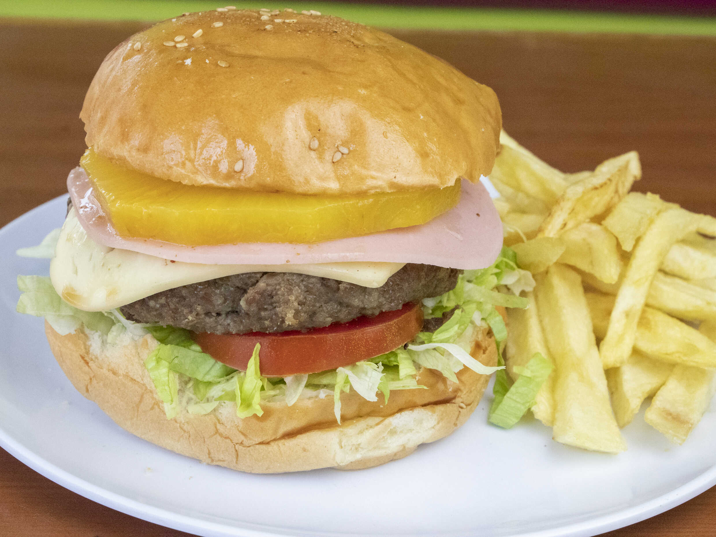 Carne artesanal, jamón, queso, piña, papas fritas, tomate, lechuga y cremas a elección.