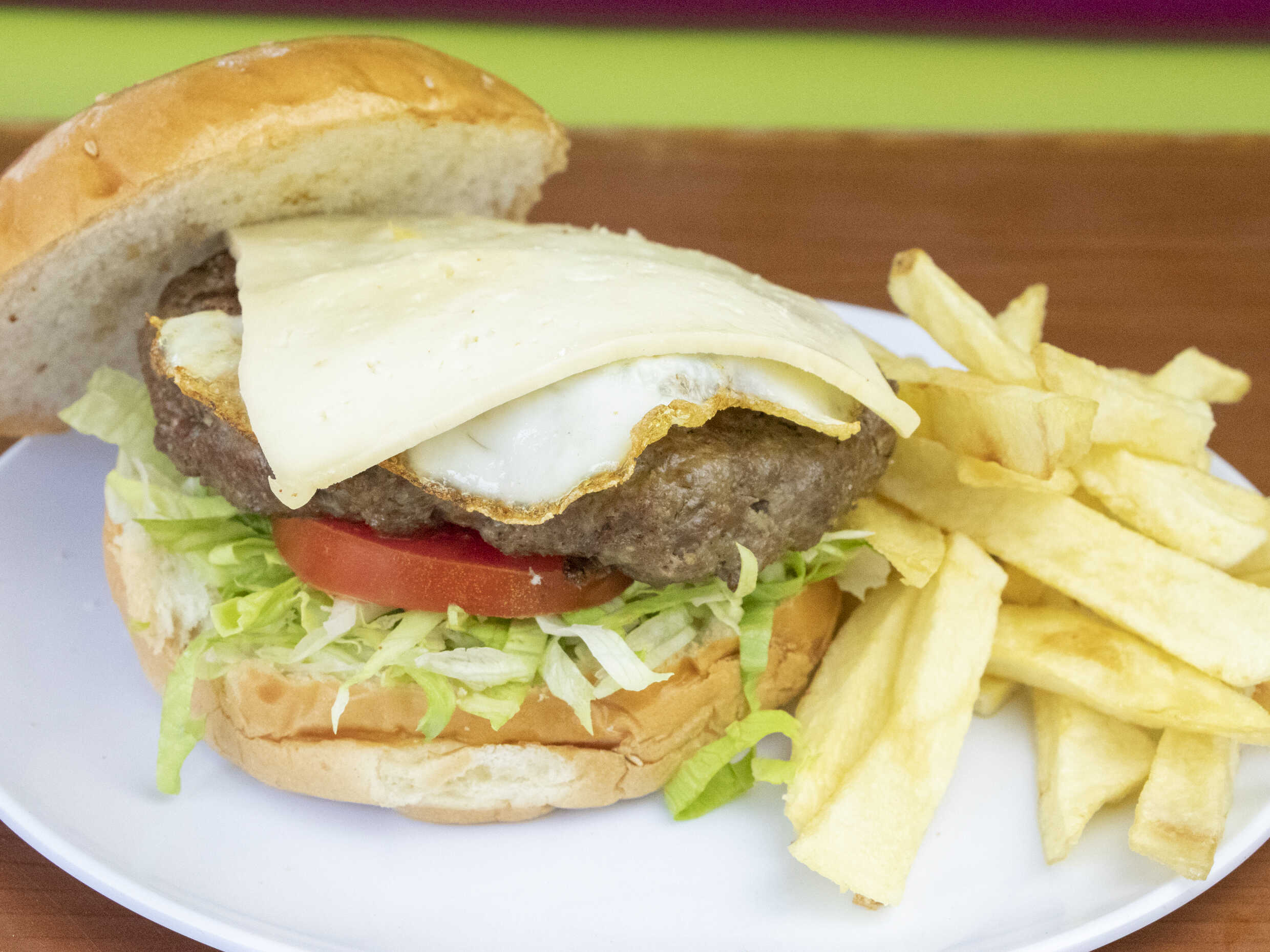 Carne artesanal, huevo, queso, papas fritas, tomate, lechuga y cremas a elección.