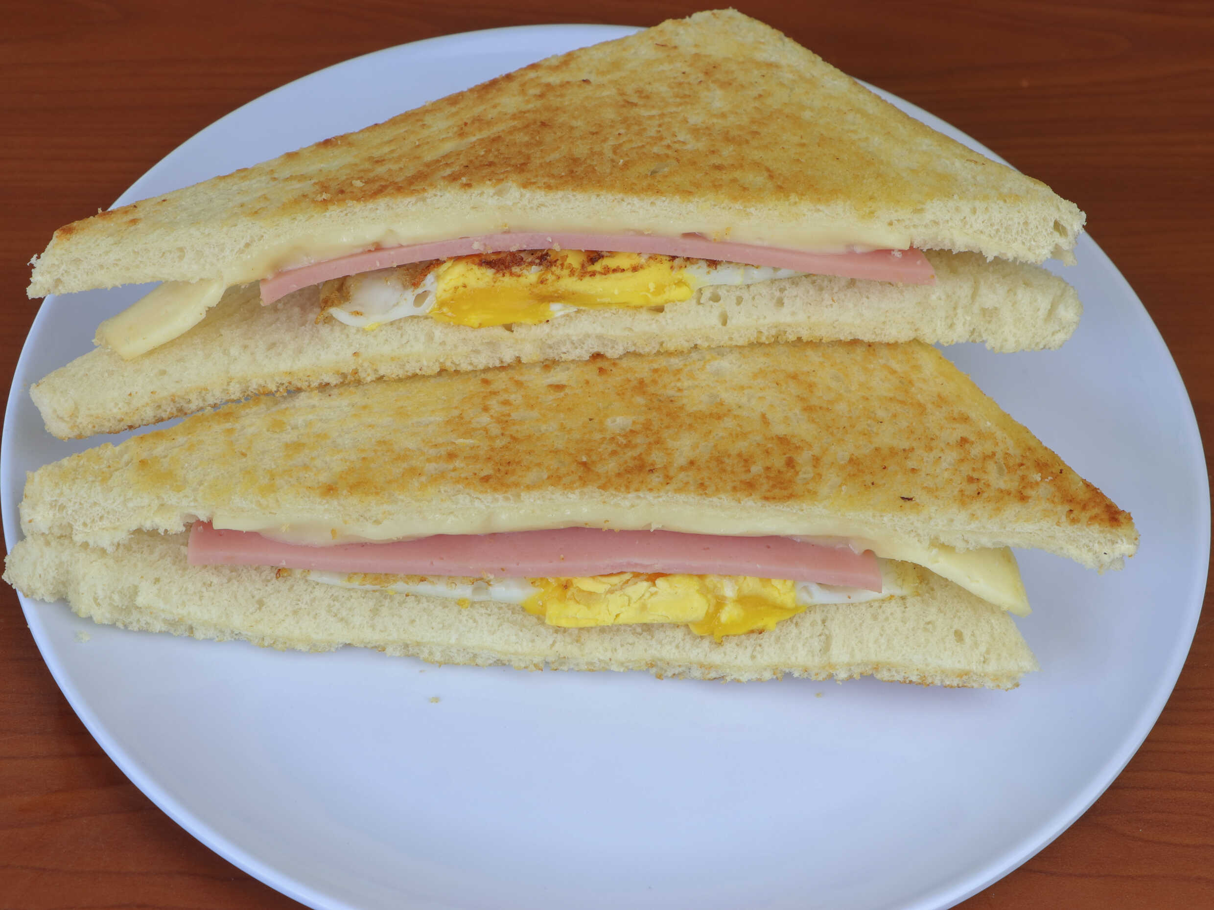 Pan de molde, jamón, queso y huevo.