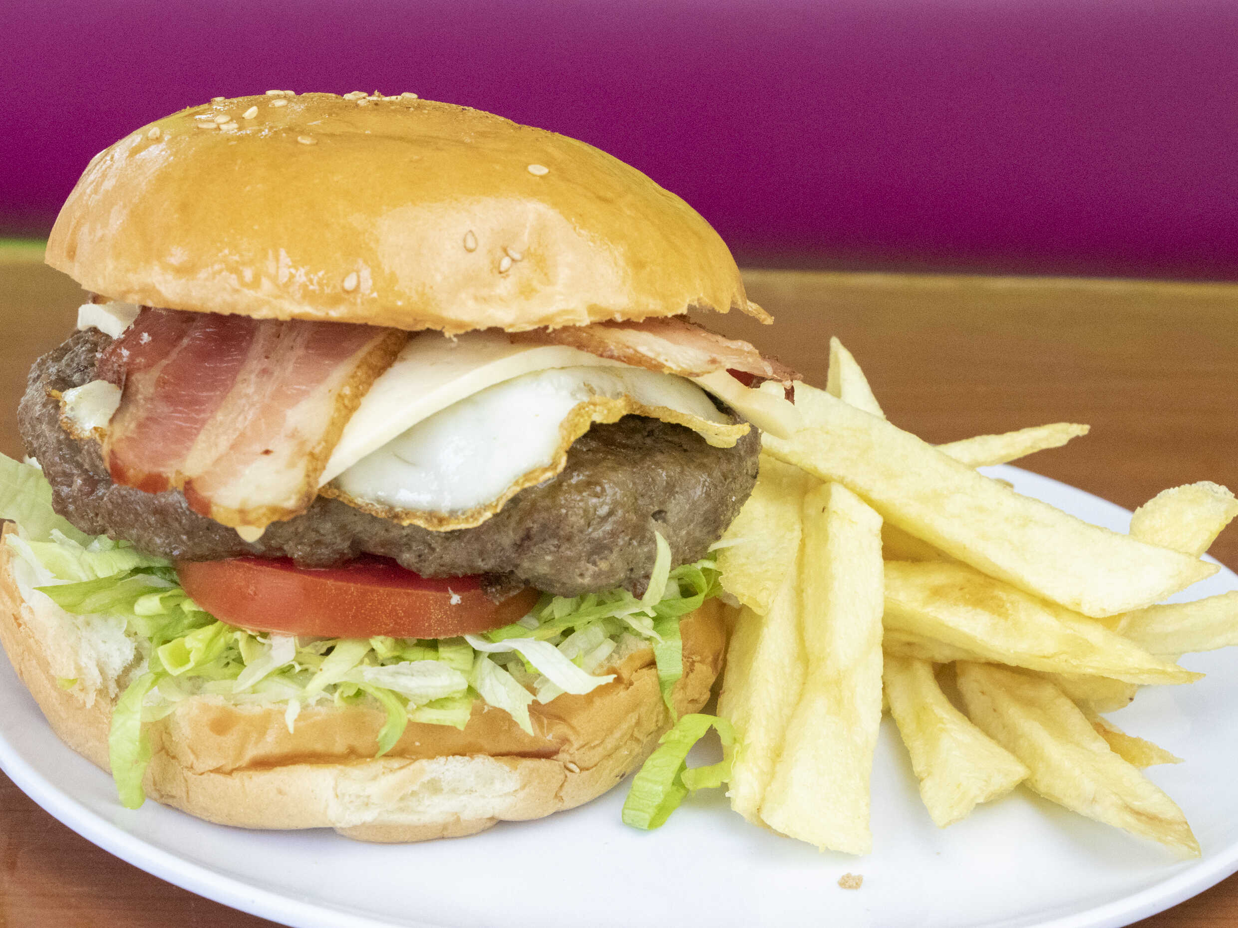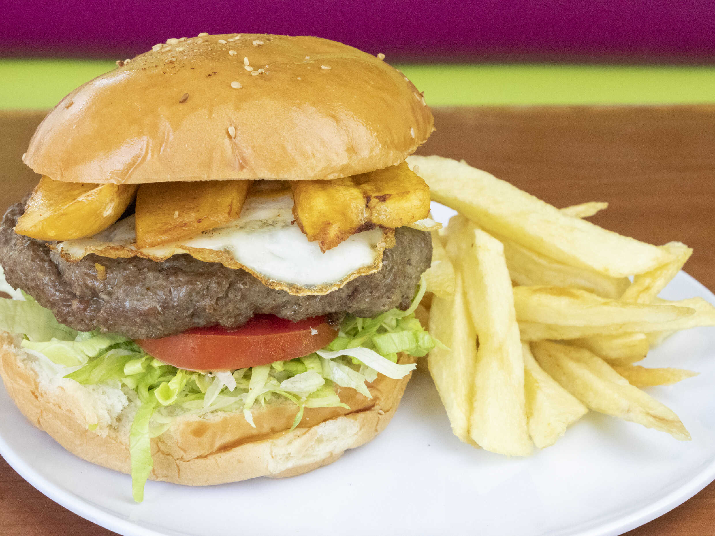 Carne artesanal, plátano, huevo, papas fritas, tomate, lechuga y cremas a elección.