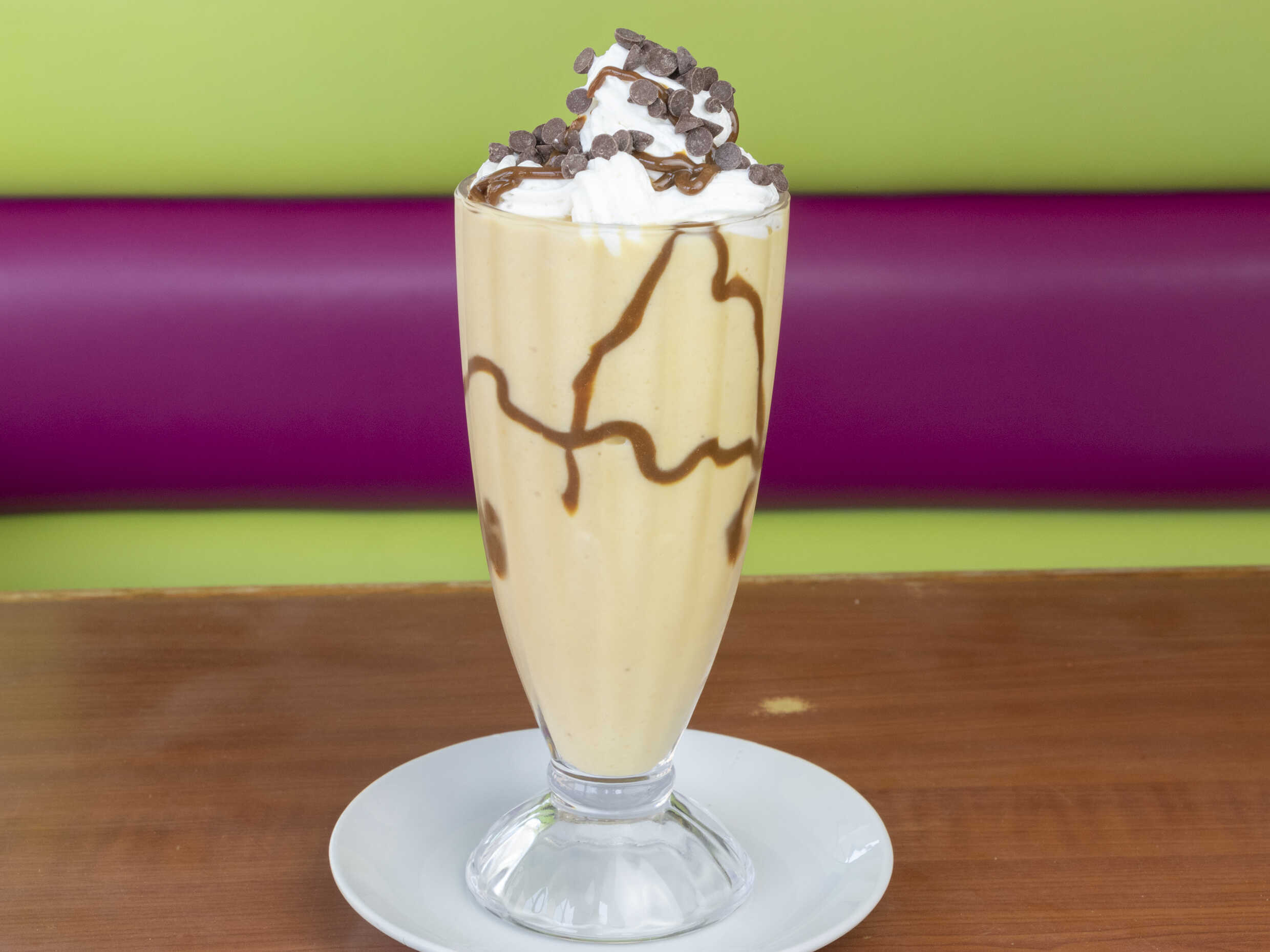 Frappé de lúcuma, chantilly, chocolate y chispitas de chocolate.