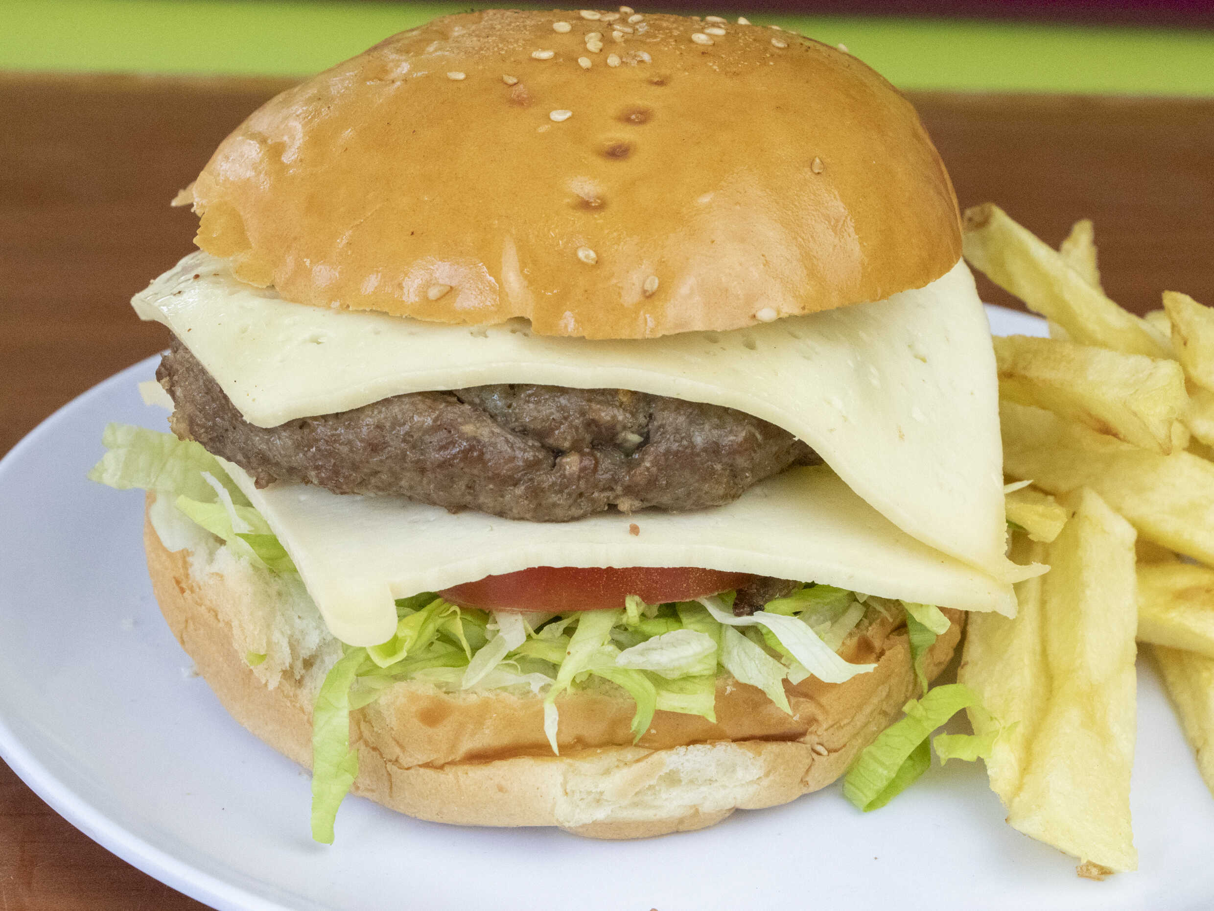 Carne artesanal, doble queso, papas fritas, tomate, lechuga y cremas a elección.