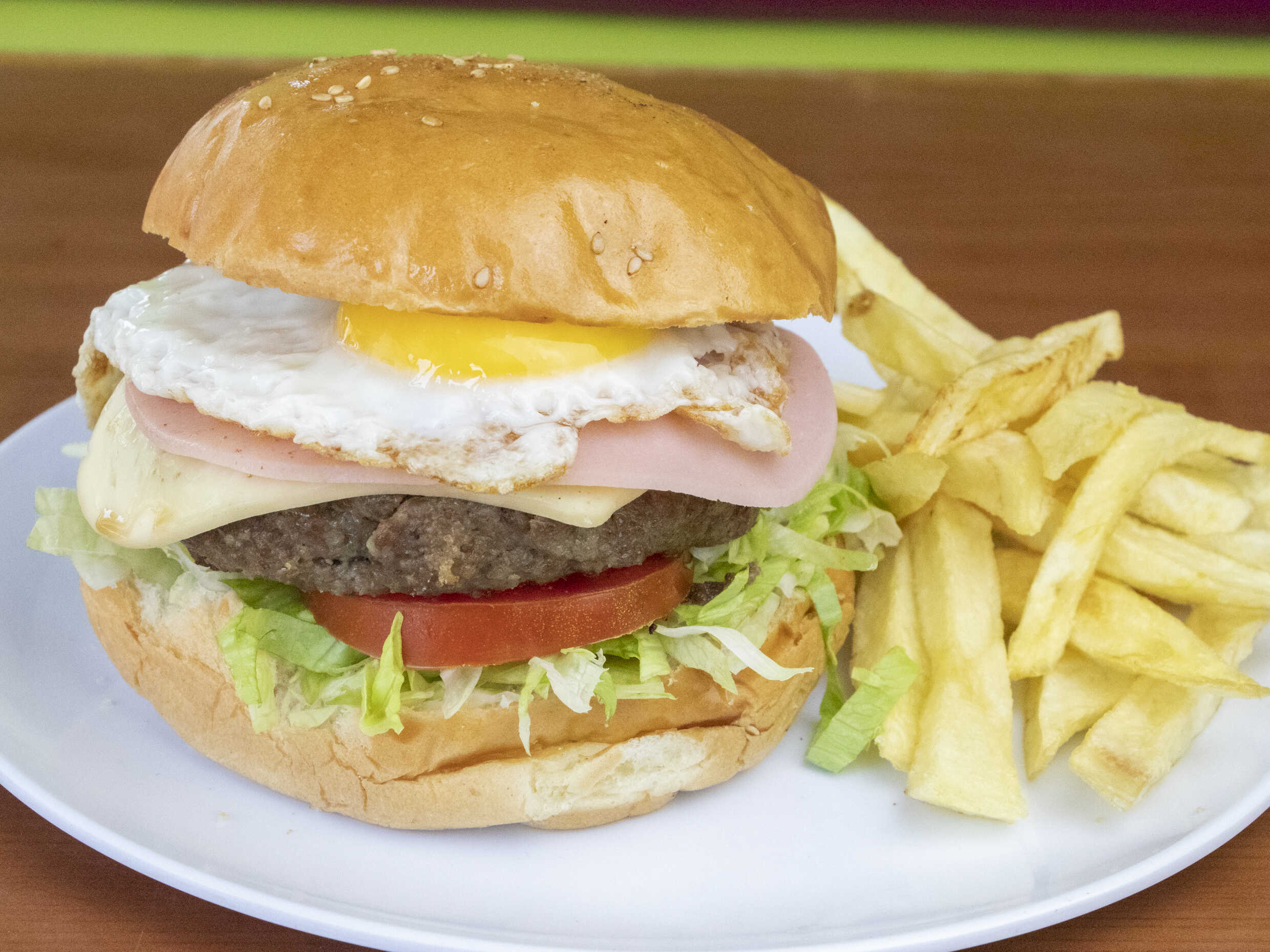 Carne artesanal, huevo, jamón, queso, papas fritas, tomate, lechuga y cremas a elección.