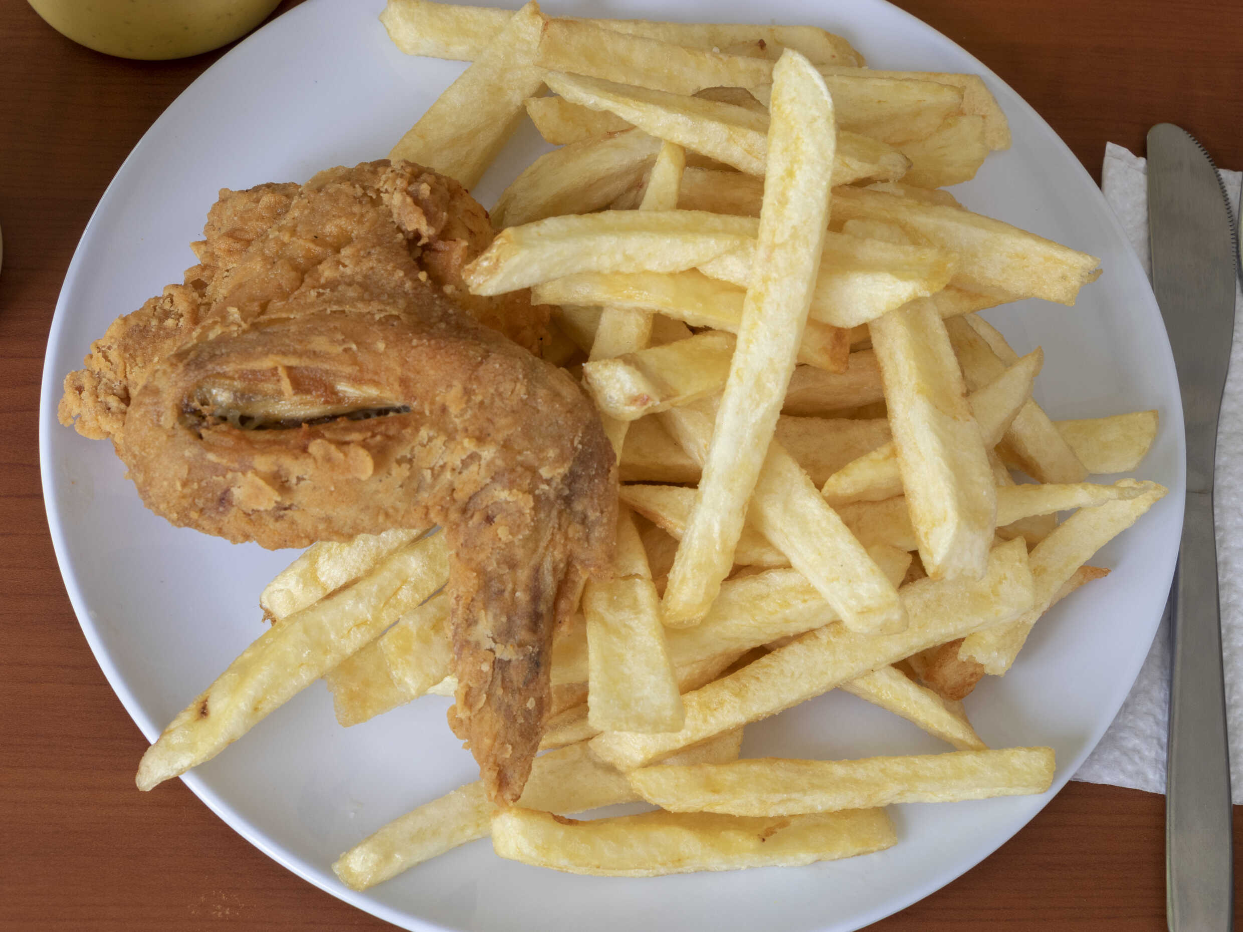 Broaster muslo, papas fritas y cremas a elección.