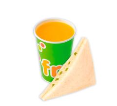 Incluye 2 jugos clásicos medianos, 1 panini de jamón y queso más 1 triangulo de pollo y apio.