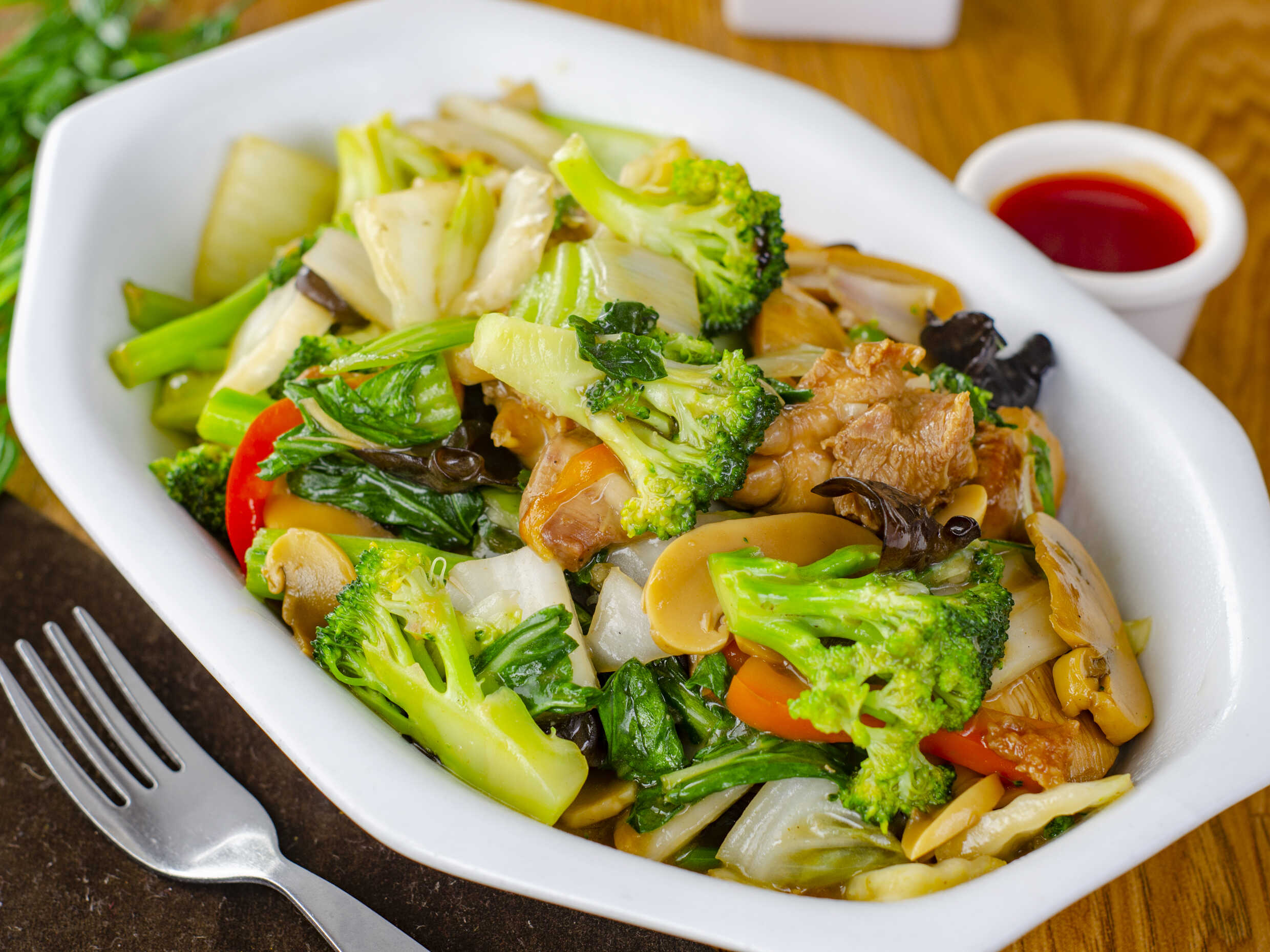 Chancho con verdura yChaufa c/sopa o wantan frito