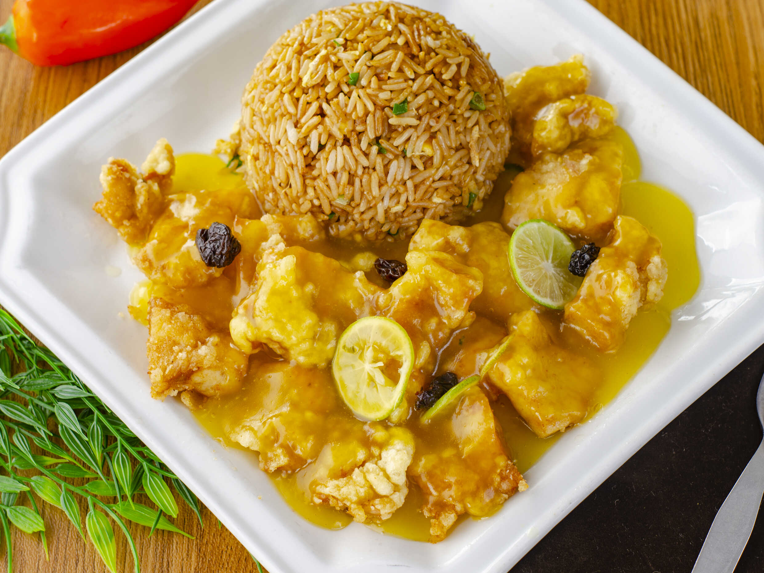 Pollo LimónKay Agridulce y Chaufa con Sopa o want.