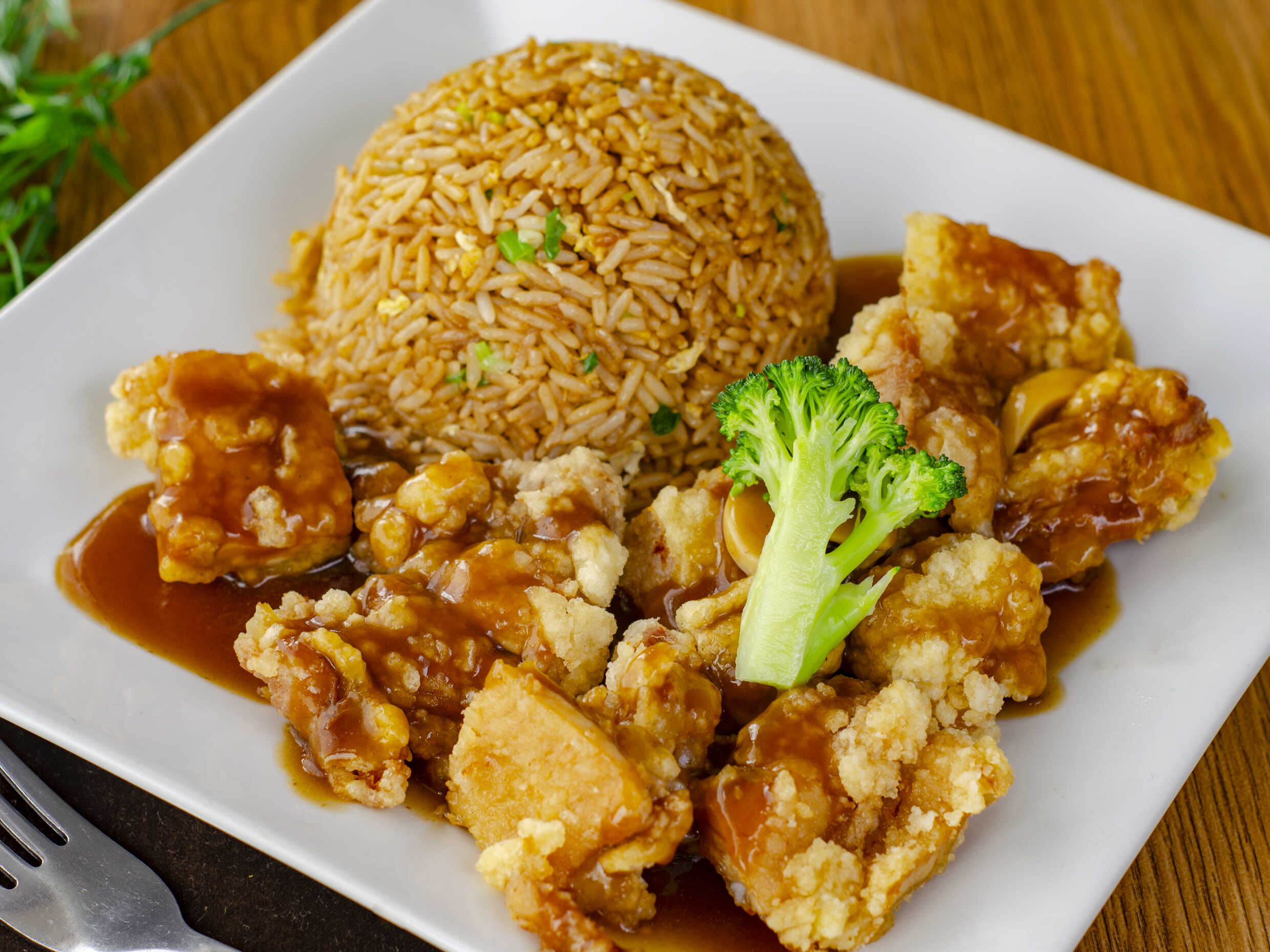 Chicharrón de Pollo y Chaufa / sopa o wantan frito